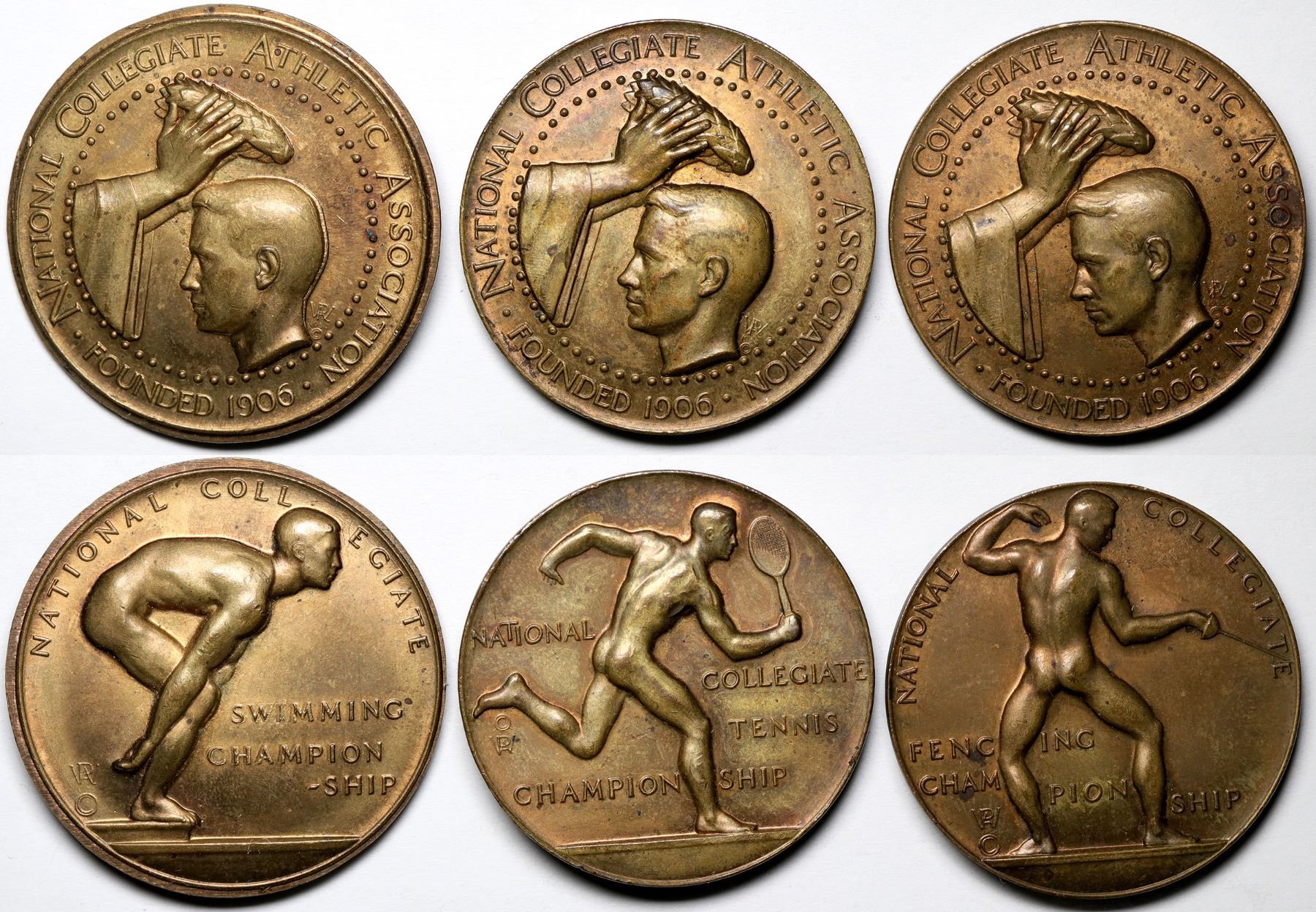 Lot of three National Collegiate Athletic Association medals, with championships in Tennis, Swimming and Fencing. Raised caricatures of athletes, with words, "Founded in 1906." Copyright by RW, brass, 1-1/2 inch diameter. See photos for more details.