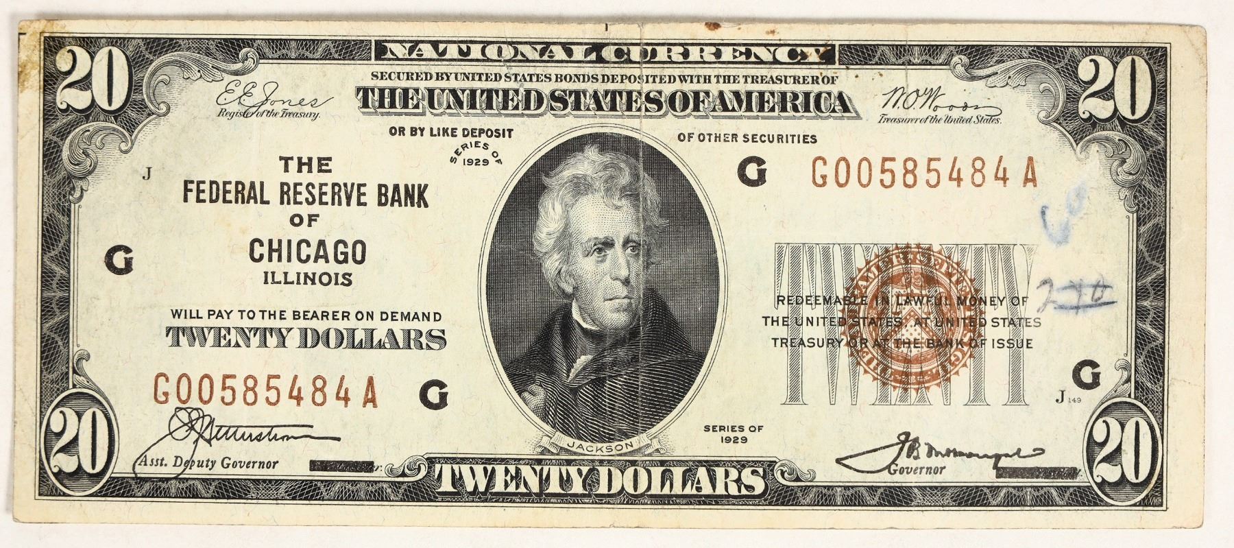 Federal Reserve Bank of Chicago $20 National Currency note, series of 1929. F-EF condition, some ink marks. Brown seal. Fr. 1870-G.