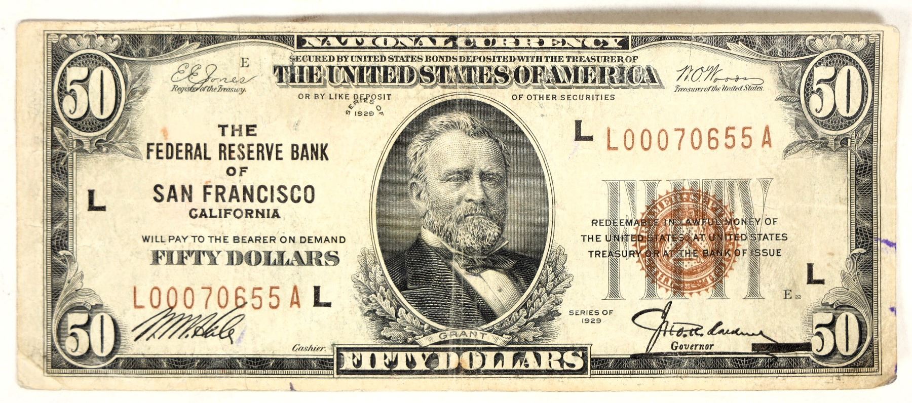 Federal Reserve Bank of San Francisco $50 national currency note. Series of 1929. VG-F condition with some ink marks. Fr. 1880-L.
