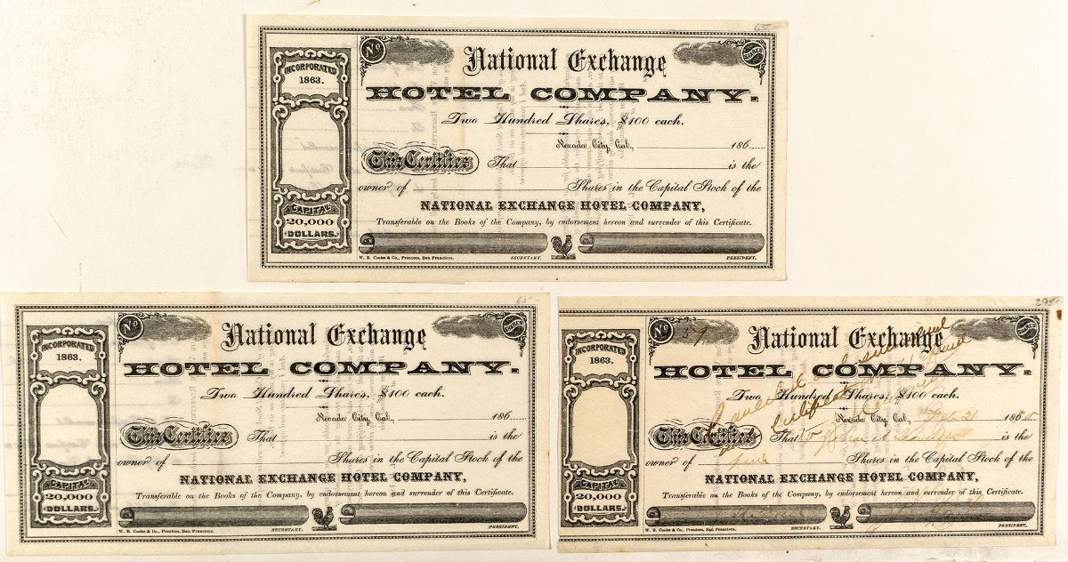 Rare. Three certificates, one issued in 1875 (dateline Nevada City), the other unissued. Issued is pen cancelled. Signatures and ink very faint. Printed by W.B. Cooke & Co., San Francisco. Delicate paper. 4.25" x 8.5" (Prag Collection) City: Nevada City State: California Date: 1875 ID# 34129