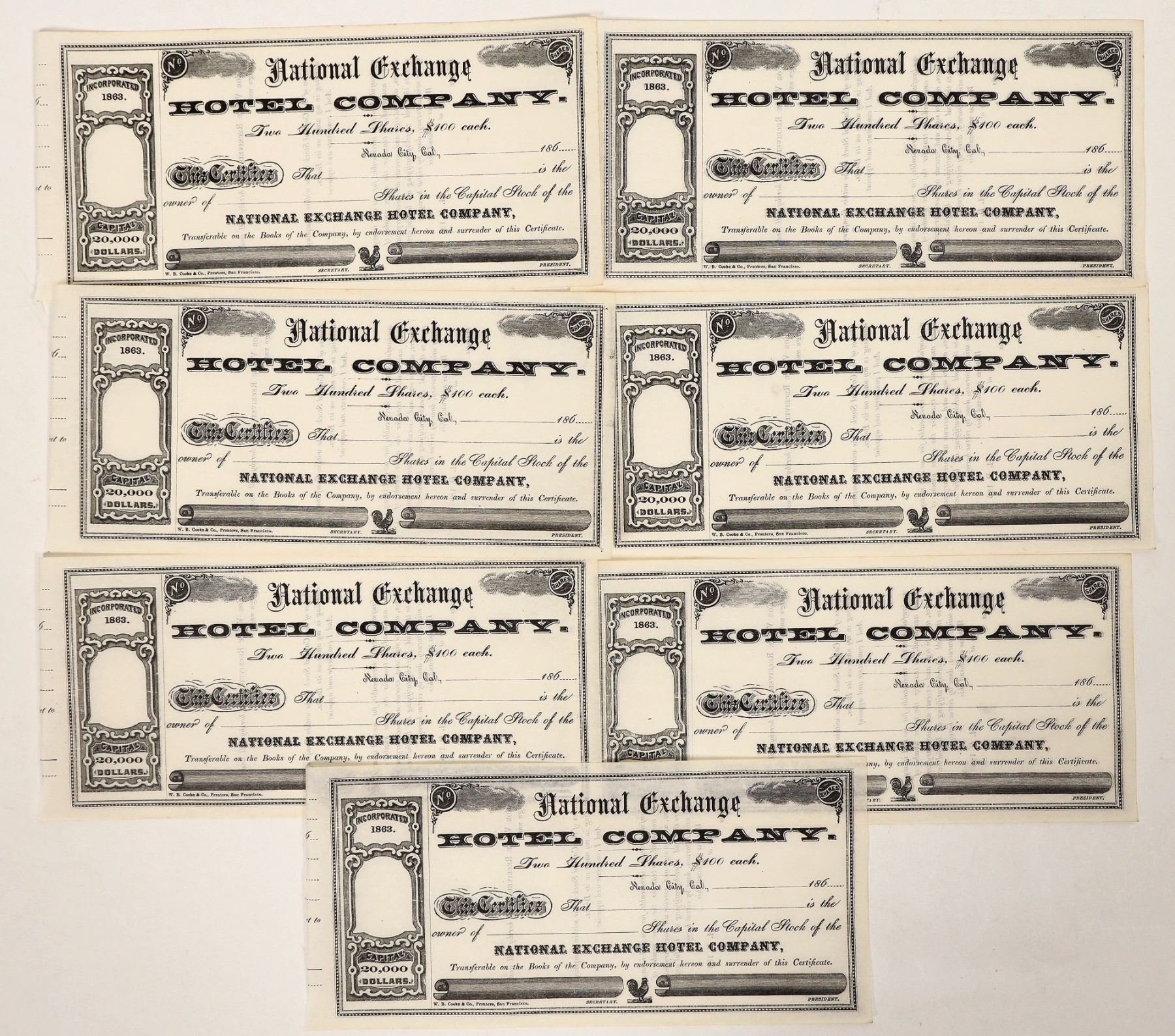 A group of 7 unissued stock certificates from the National Exchange Hotel Company of Nevada City, California, dating from the 1860s. Founded in 1856, the National Exchange Hotel remains operational in Nevada City to this day, keeping the history of the iconic Gold Rush town alive. All are trimmed on the left. Excellent condition with almost no toning or wear.