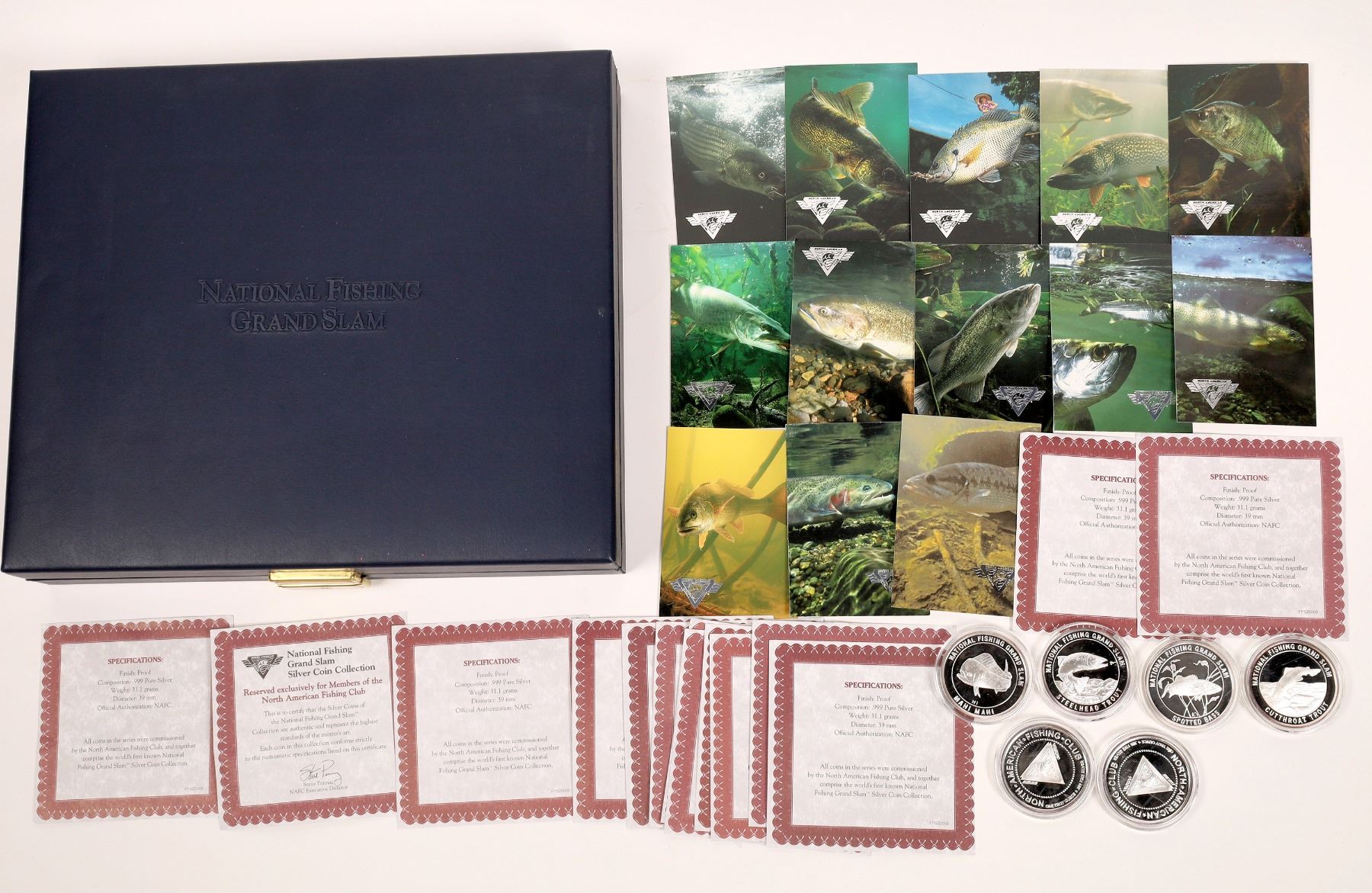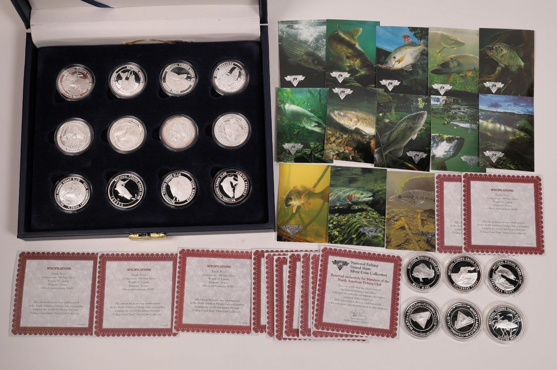 Issued by the North American Fishing Club. In a blue locking case, 18 one ounce silver rounds each commemorating a fish. 13 color trading cards featuring the fish. The case has five empty spots. Each silver piece is 0.999 pure silver, 31.1 grams, 39 mm.