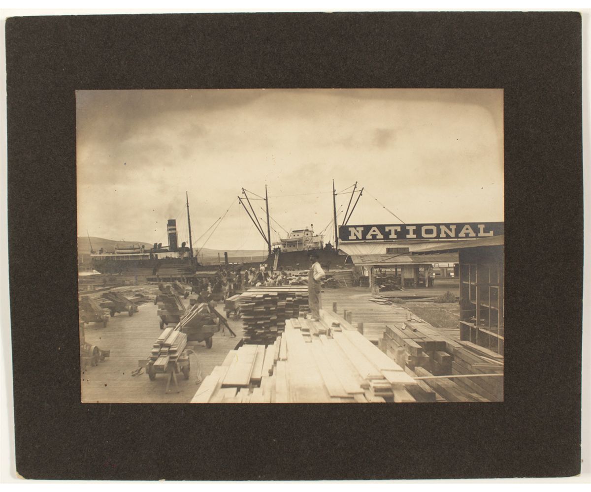 Early black and white photograph showing lumber yard on waterfront. National sign at right. Ship in the background. Nice contrast! Measures 8.25" x 6" on 11" x 9" cardboard.
