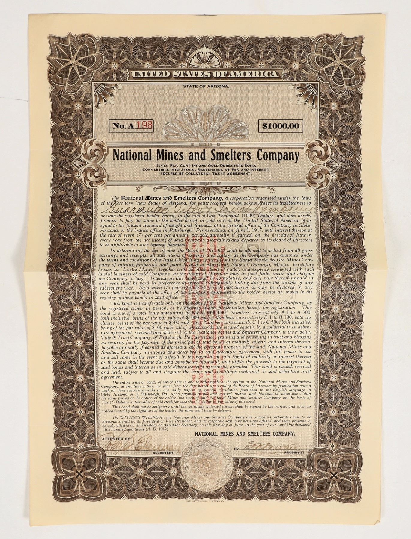 National Mines and Smelters Co. $1000 Bond, 7% gold debenture bond. Embossed seal, Republic BNC printer. VF cond. Rare