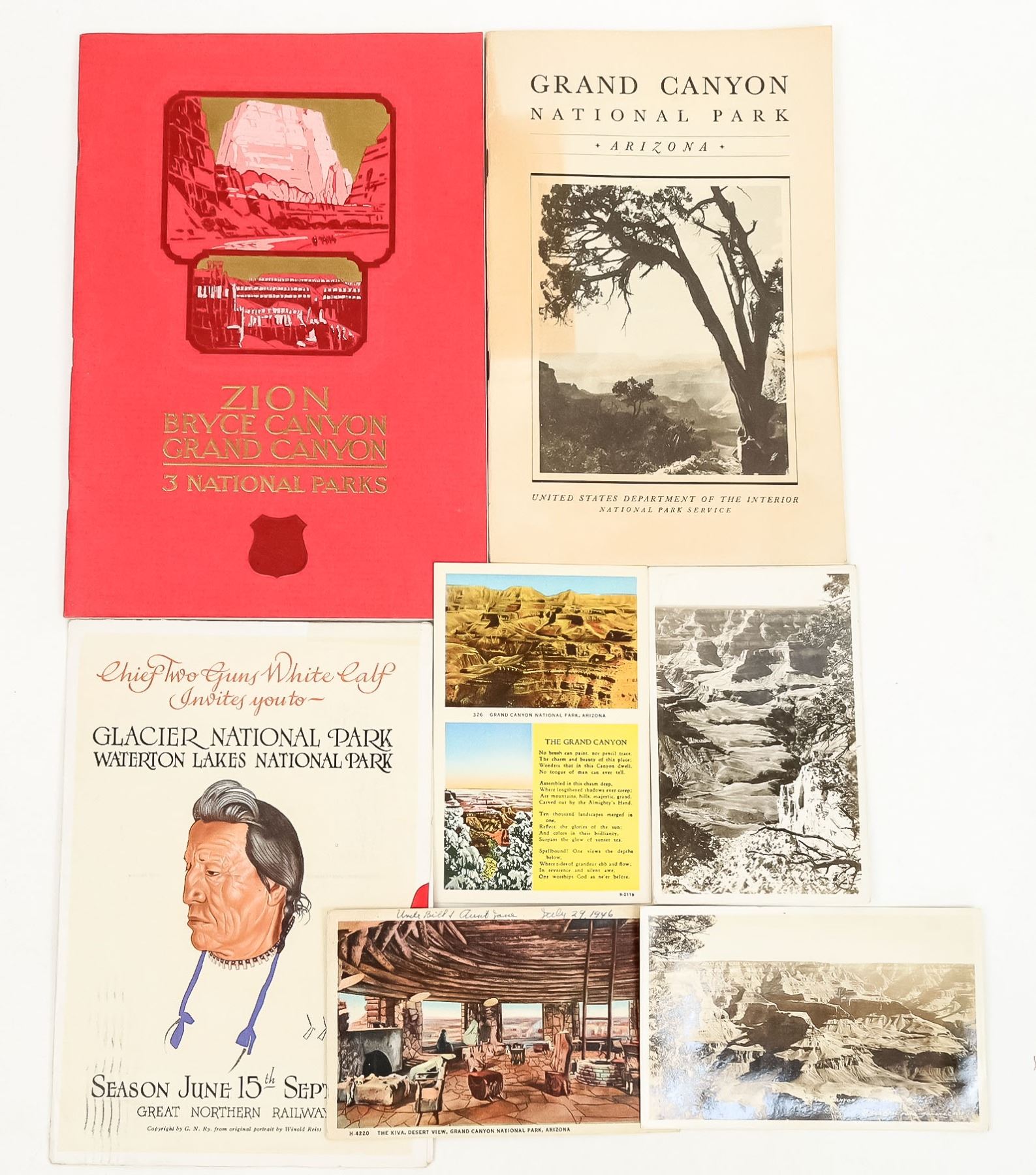 Grand Canyon National Park, Arizona, Dept. of Interior, 1935. Contains photos, illustrations, & foldout map - (6" x 9" booklet, 42 pages - 2) Glacier & Waterton National Parks, provided by Great Northern Railway, C-1930 - Provides guided tour schedules for the 2 parks for up to 4 days - (multi-fold pamphlet opens to 23 1/2" x 17" full-page set of featured park locations & services ) - 3) Booklet containing 3 National Parks: Zion, Bryce Canyon & Grand Canyon, issued by the Union Pacific System, 1929 - Attractive booklet has cover in red with lettering embossed in gold - Entire publication is first class and gives the tourist a multitude of things to do and see - 56 pages are filled with all kinds of information, photographs, maps & art, some in color. - (7" x 10") - This lot also includes 10 postcards with each park represented).