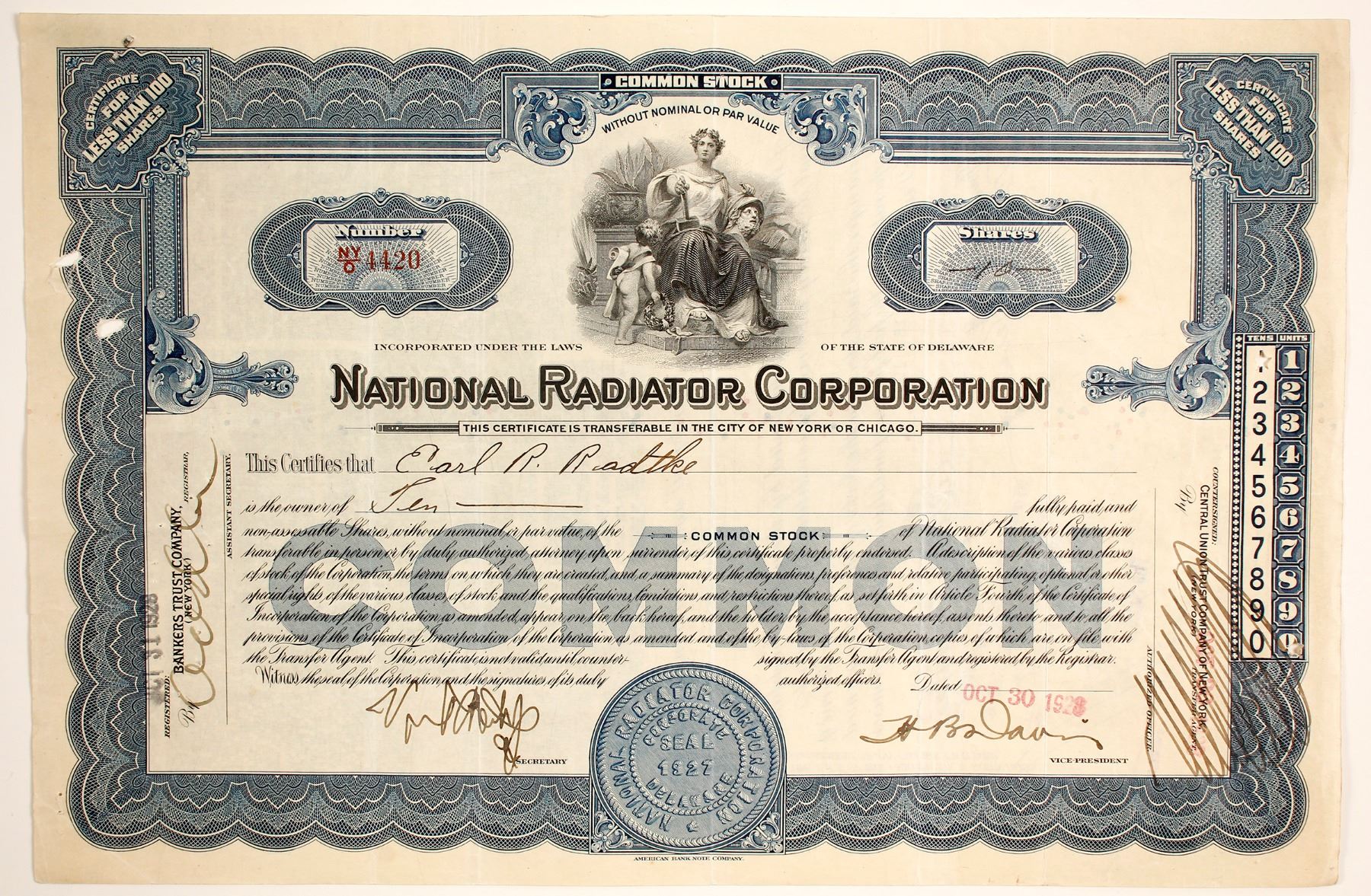 10 cancelled shares of National Radiator Corp. cert. # NY/O 4420 dated Oct. 30, 1928, registered Oct. 31,1928. issued to Earl R. Radtke. Blue company seal and border. Vignette of women with hammer, child and man's head. National Radiator Co. developed from the earlier Fowler Radiator Co. (est. 1894). In 1902 the company was renamed National Radiator Co. Company expanded, and by the 1920's had plants in Trenton, NJ, Lebanon and New Castle, PA. On Aug 8, 1927 National Radiator Corp of Delaware was established under the name Union Radiator Co., the Gurney Heater Canufacturing company, Continental Heater Co., the Niagra Radiator and Boiler Co, and Utica Heating Co. Early 1930's company had debt problems and reorganized, placed into receivership and re-established. Directors of the company approved a merger in 1954 with the US Radiator Corporation. Printed: American Bank Note Co. Prag collection.