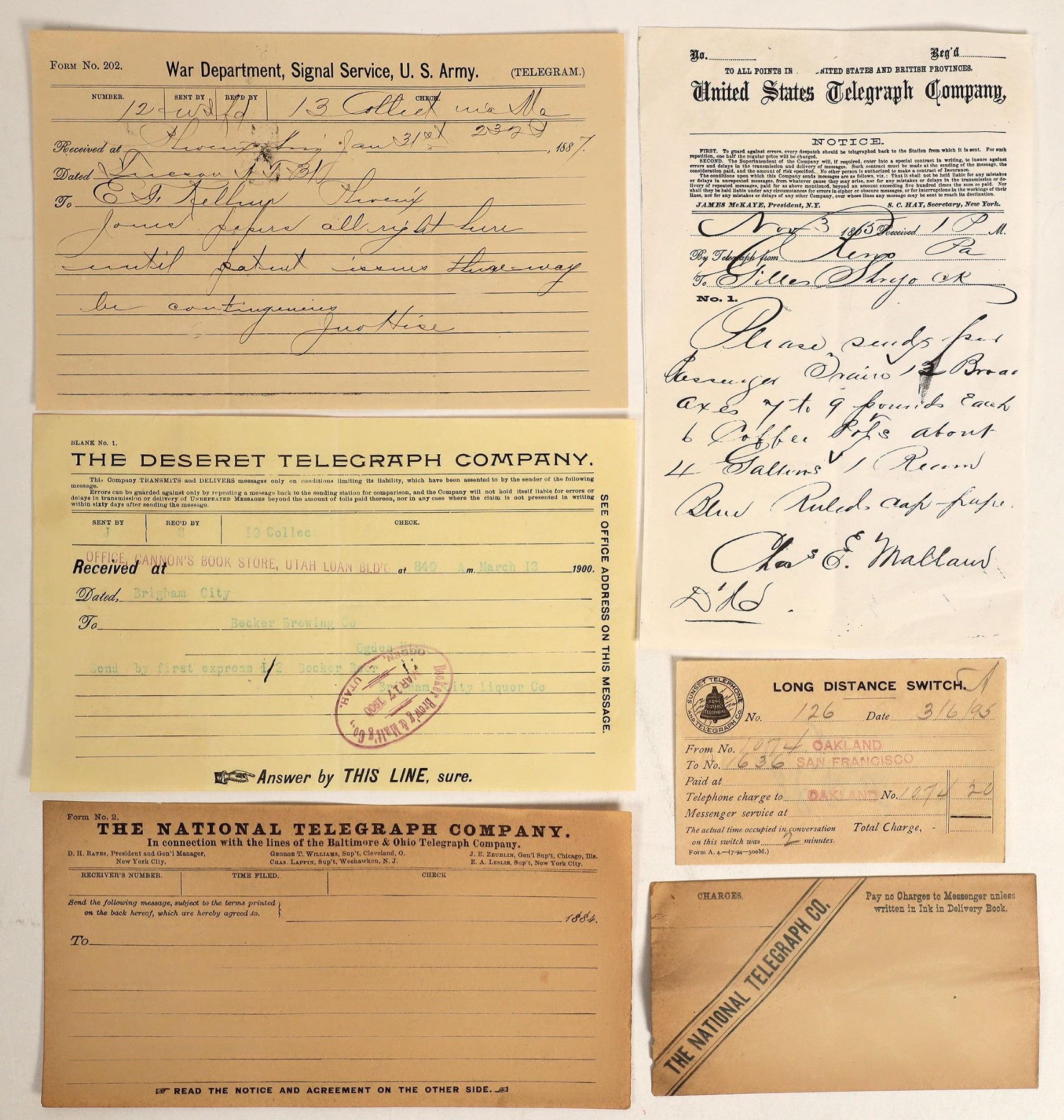 Lot of 6. 1) War Department Signal Service, US Army, sent from Tucson, Arizona, 1887. Message about "patent issues." 2) United States Telegraph Company, Reno, Pennsylvania, 1865, about sending axes and coffee by train. 3) The Deseret Telegraph Company. Brigham City, Utah, 1900. To Becker Brewing Company. 4-5) National Telegraph Company cover and telegram, unused, 1884. "In Connection with the lines of the Baltimore & Ohio Telegraph Company." 6) Sunset Telephone & Telegraph, long distance switch, 1895, California Bay Area.
