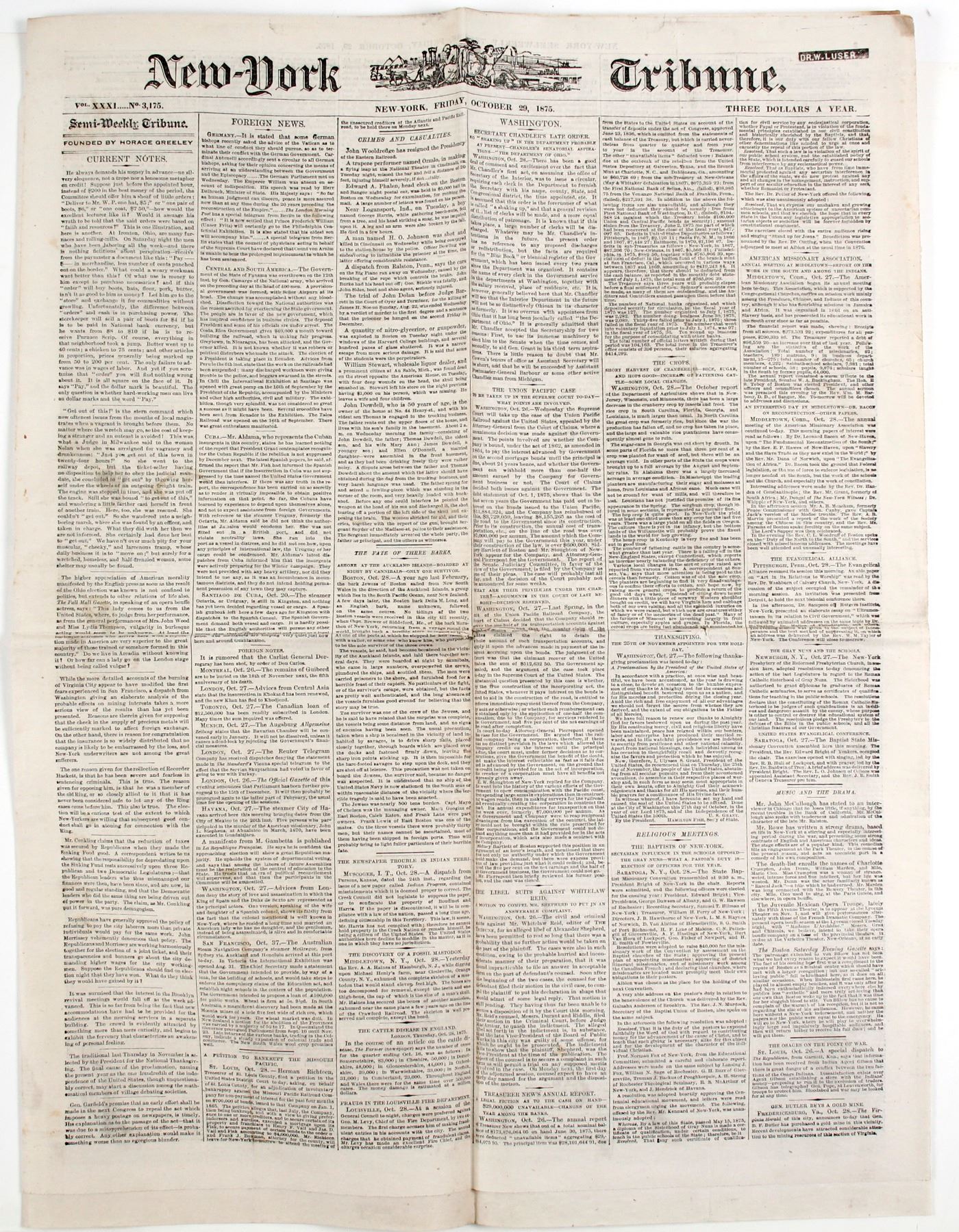 "The Burning of Virginia City" in the New York tribune, October 29, 1875. "10,000 people homeless". Nearly a full page on the tragic fire. the effects were felt worldwide. an ancillary article "A Blow to Gold Mining" discusses the ramifications on the global metal markets as the mines quit producing . Great content. This is probably the most important reporting fo teh fire to America, other than the west coast. City: Virginia City State: Nevada Date: