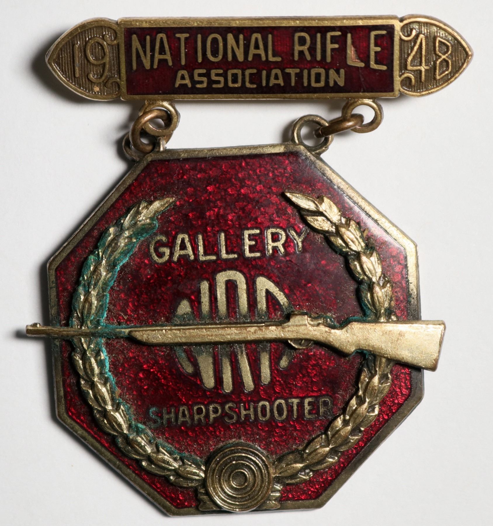 National Rifle Association Gallery Sharpshooter medal, c1948. Made of brass with red enamel, with working pin and ornate engraving of the year 1948, this 1-1/2 x 2 inch medal also features a brass rifle, a laurel wreath, target and NRA logo. See photo for details.