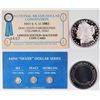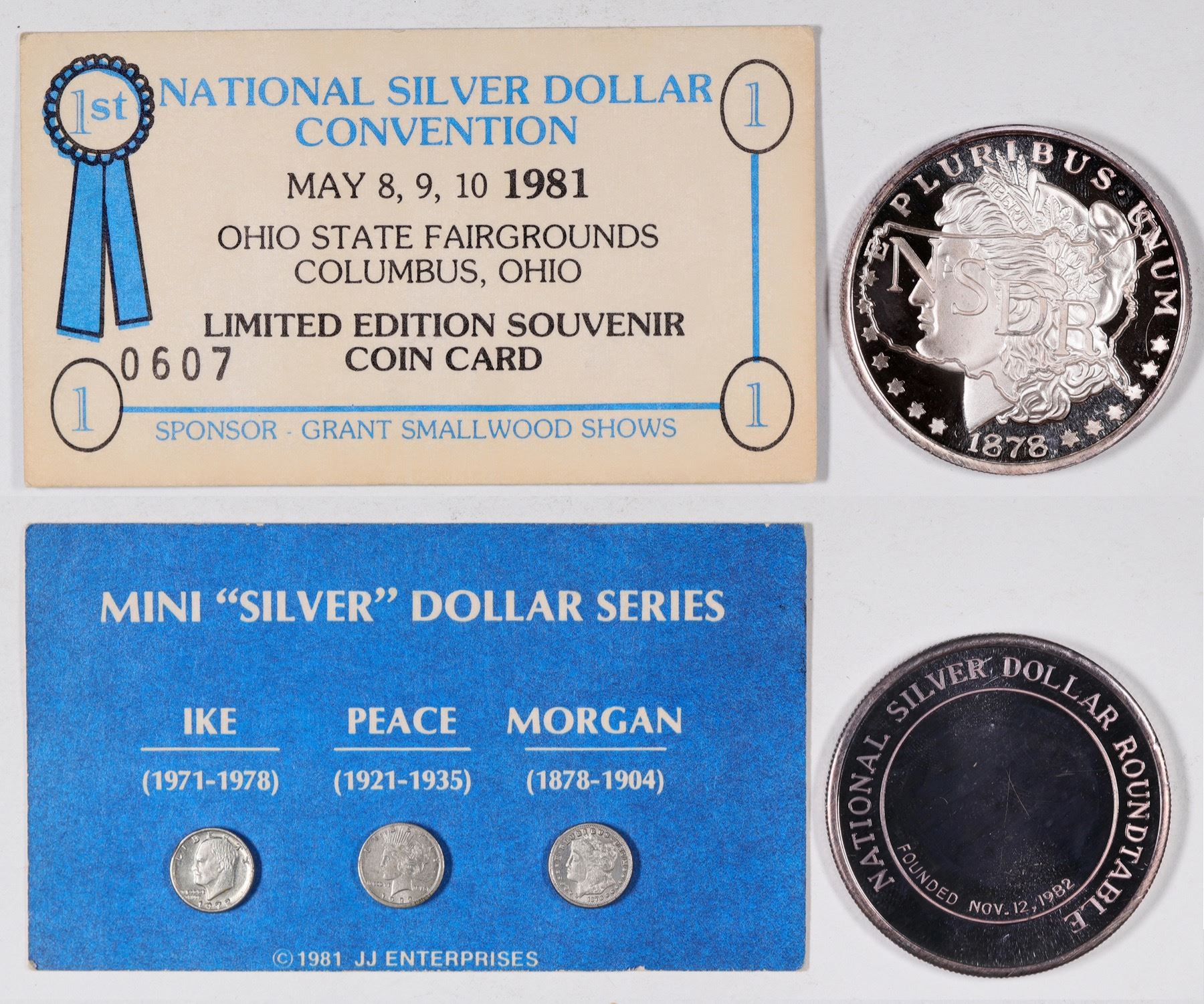 Silver round commemorating the founding of the National Silver Dollar Roundtable 1982. Limited edition souvenir Coin Card from the National Silver Dollar Convention, May 1981 with; mini "silver" dollars: Ike, Peace and Morgan, in original canvas bag.