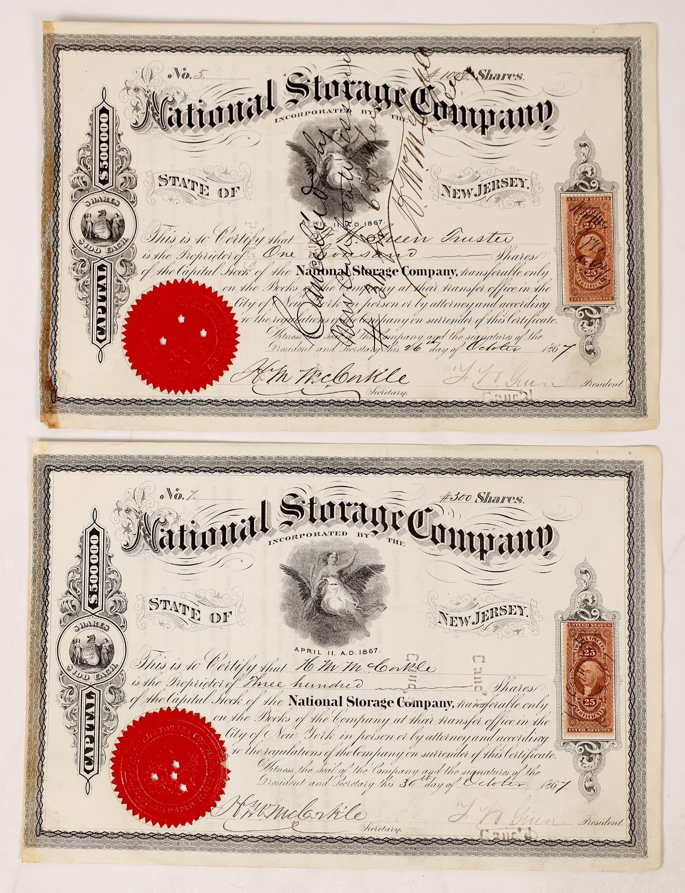2 issued 1867 National Storage stock with 25c brown internal revenue stamps. New Jersey Ken Prag Collection