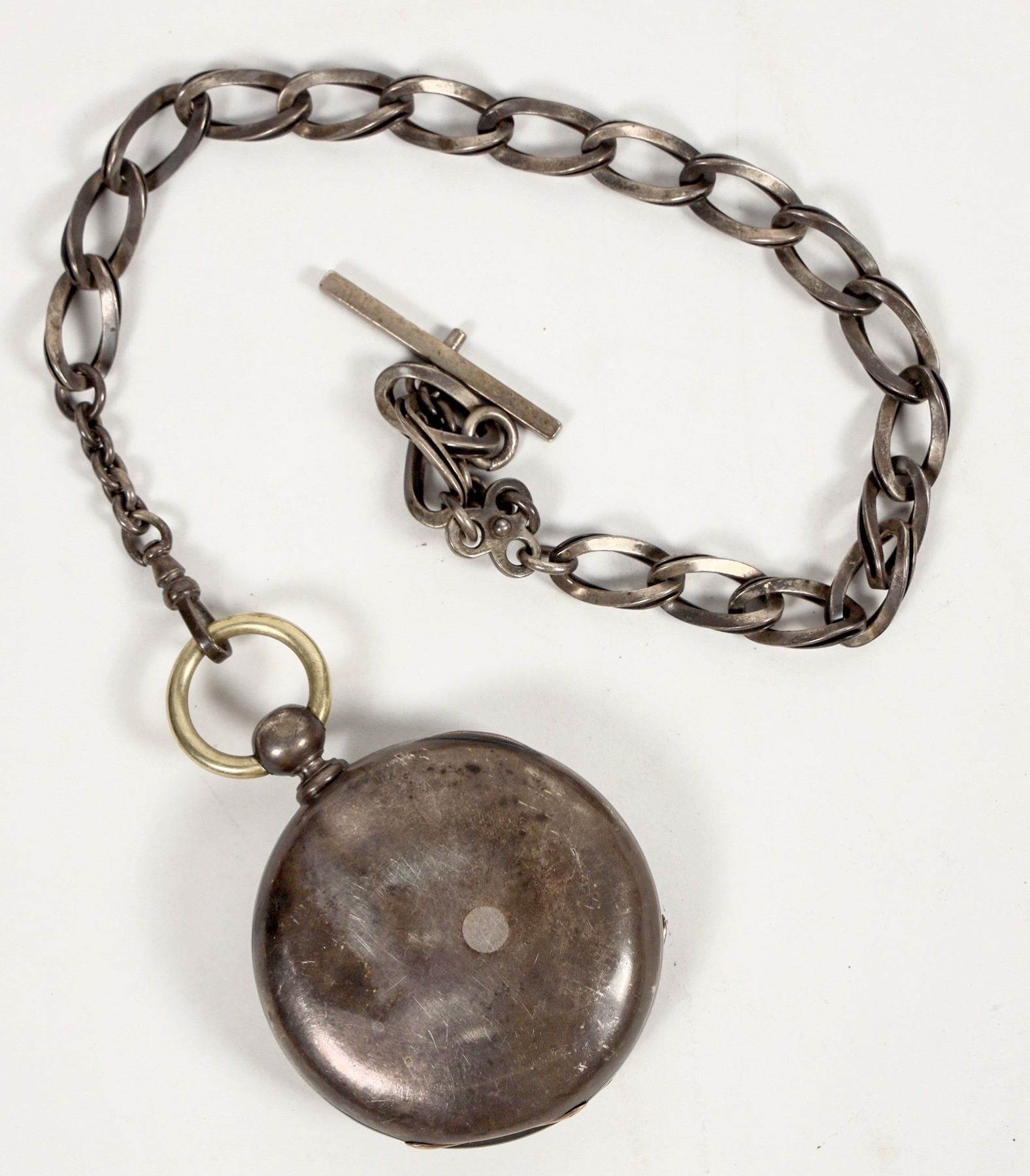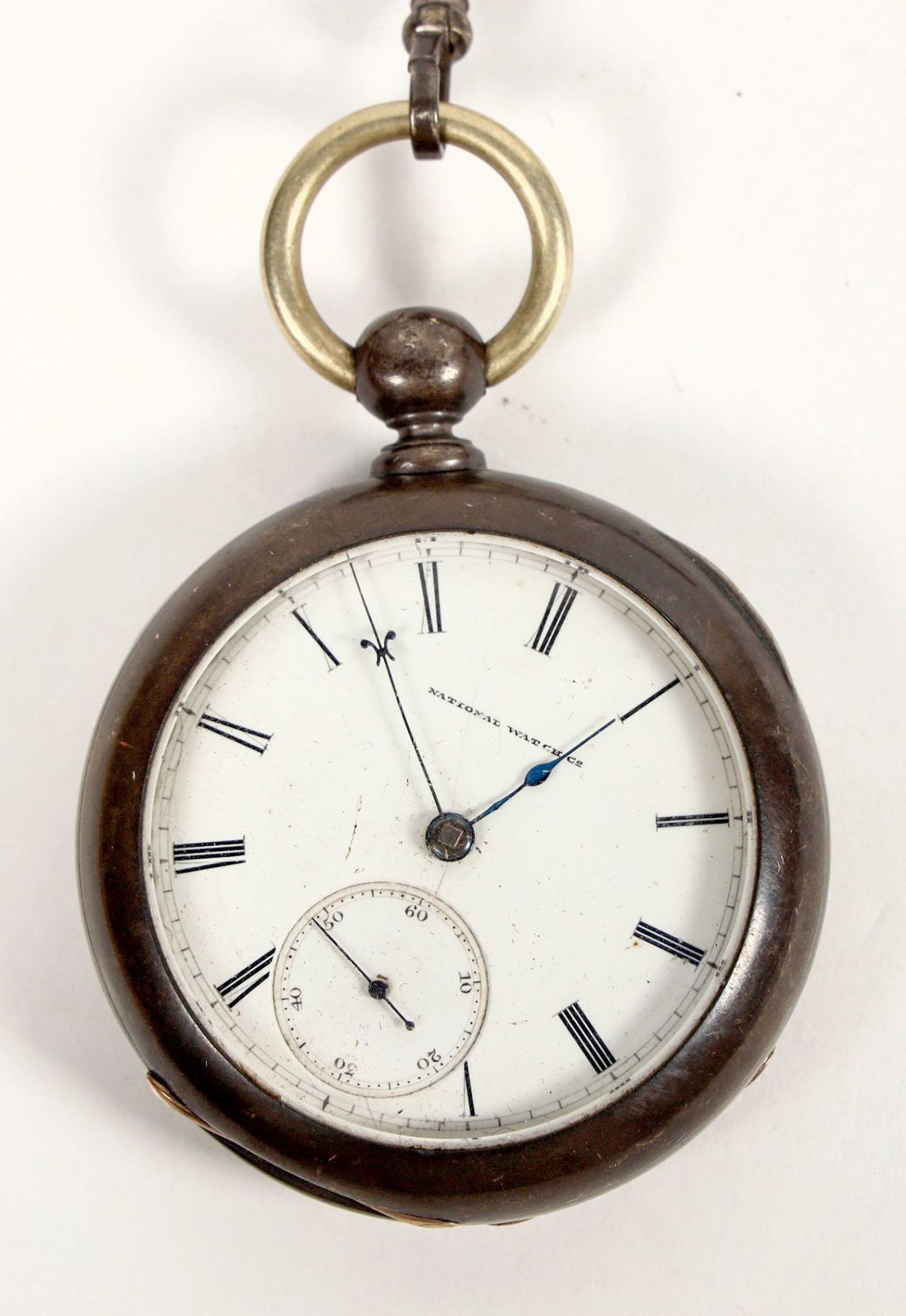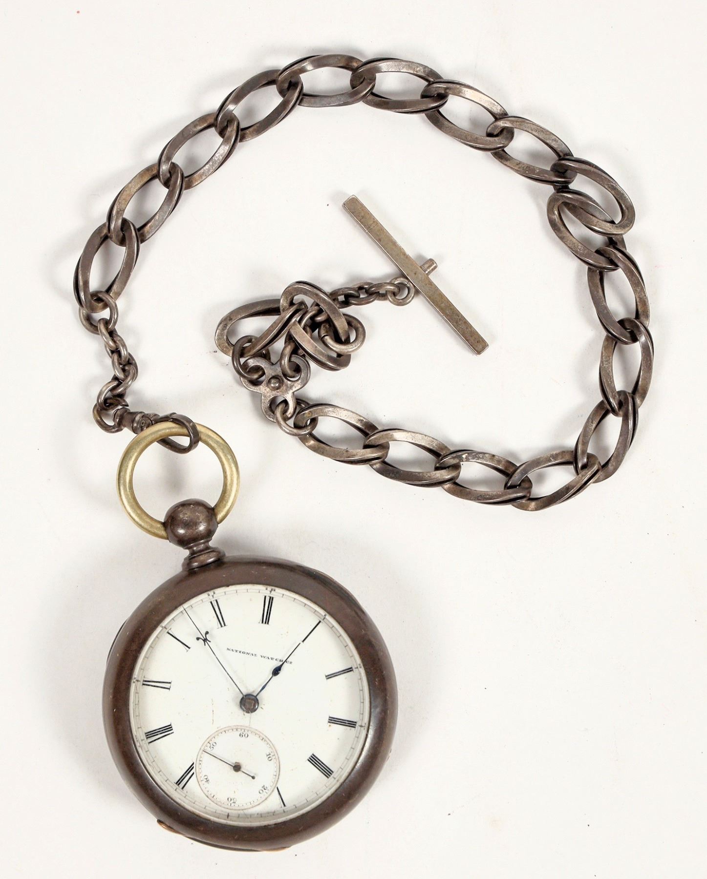 Silver Case marked Dueber Coin 170631. , National Watch Co. Pocket Watch 1871 Movement marked: MD Ogden 112974. Elgin. Patent Pinion. Model 1. 11 Jewel. Runs. Heavy duty watch chain.
