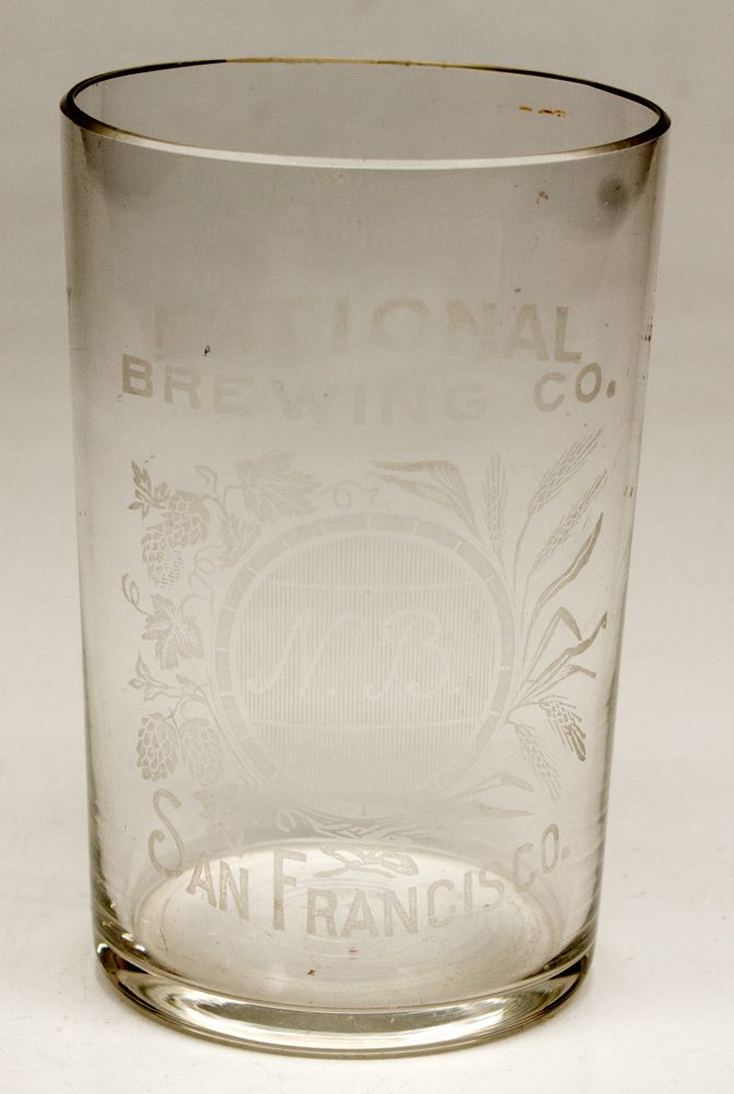 Nice National brewing company glass. Etched. Fancy scroll work around the trade mark 'N. B.' 3". Burt Collection.
