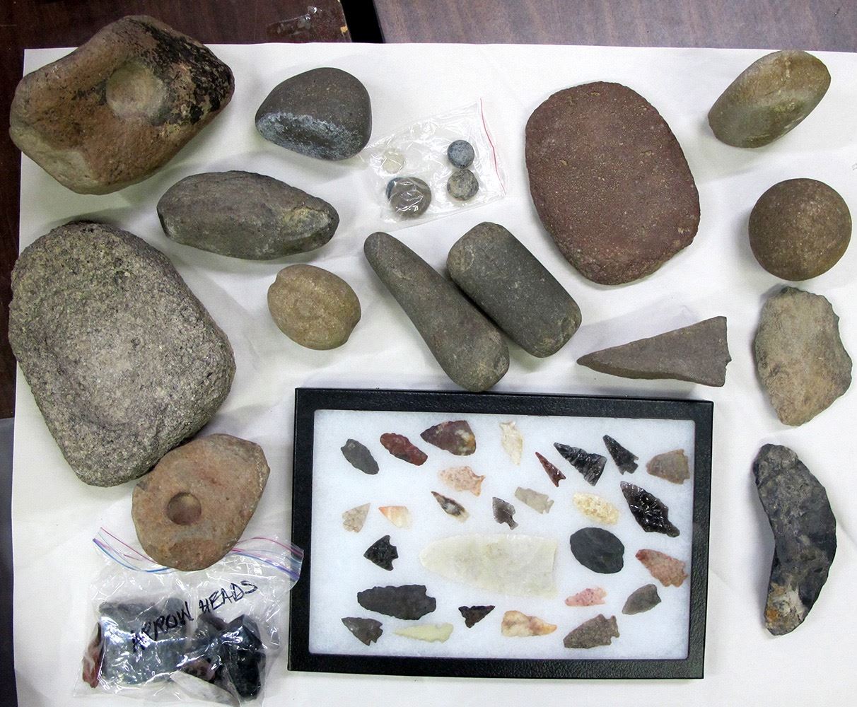 Nevada collected pieces for 1960's, includes choice projectile pieces, grinding rocks, scrapers, arrow sharpener, weights, (about 15 pieces); 29 projectile points including one spear point, 4". Date: Location: Nevada HWAC# 55119