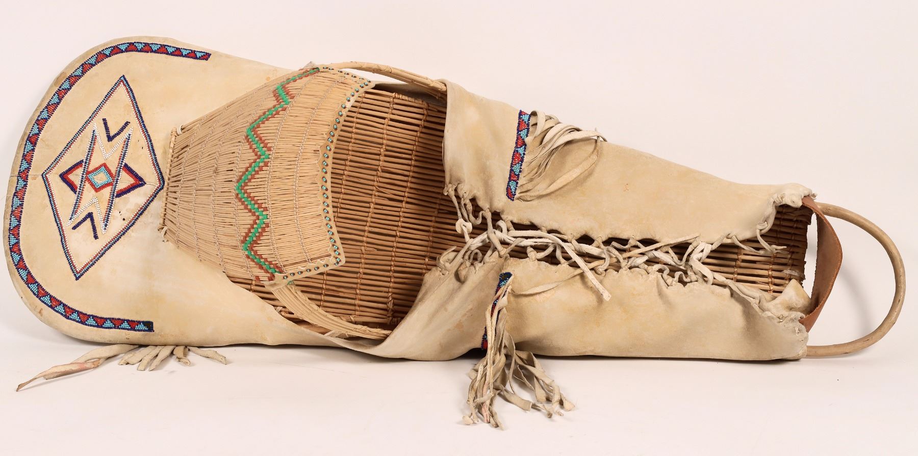 Babyboard with bamboo sides, light twining material on hood/shade, perhaps nylon string. Willow weaving material on back. Smoke buckskin covering. Brow design consistent with a baby girl. Bannock stitch on beadwork. Acquiring patina with age. 40x14x12".