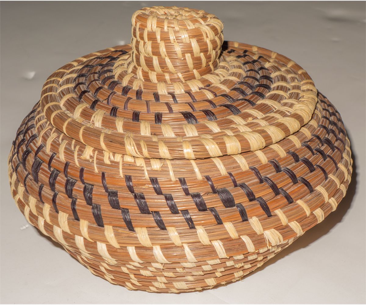 Conshatta Tribe Indian piece by Ada Abbey. Small bowl shape with cover, traditional woven design on base and top. Made of raffia and pine needles twisted coils. Measures 5.5" tall (w/ lid), 7" in dia. Sharp banded coloring, excellent condition.