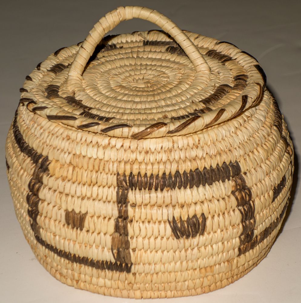Papago Indian piece. Small bowl shape, with traditional geometric design and woven rafia top edge on lid. Made from Beargrass coils. Measures 3" tall, 5" in dia. Sharp coloring, excellent condition.