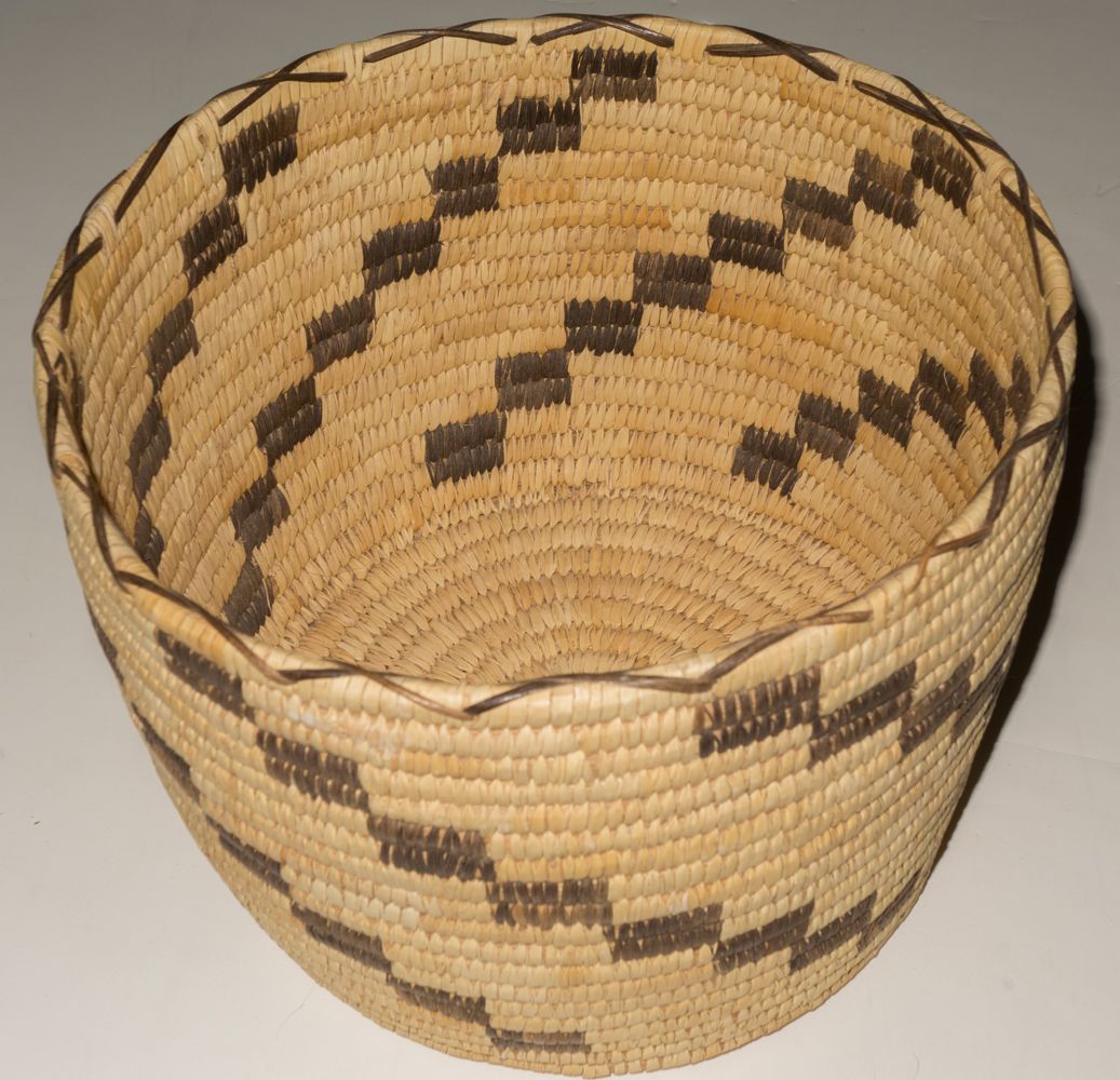 Plains Indian piece. Large cylindrical shape, with traditional lightning bolt design and woven rafia top edge. Measures 7" tall, 10" in dia. Sharp coloring, excellent condition.