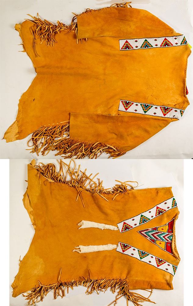 Native American beaded deerskin shirt. Almost new, probably made for Pow Wow dances. Men's size. Beautifully made and beaded with small fur hides (rabbit) hanging from beaded area. State: City: Date: ID# 48567