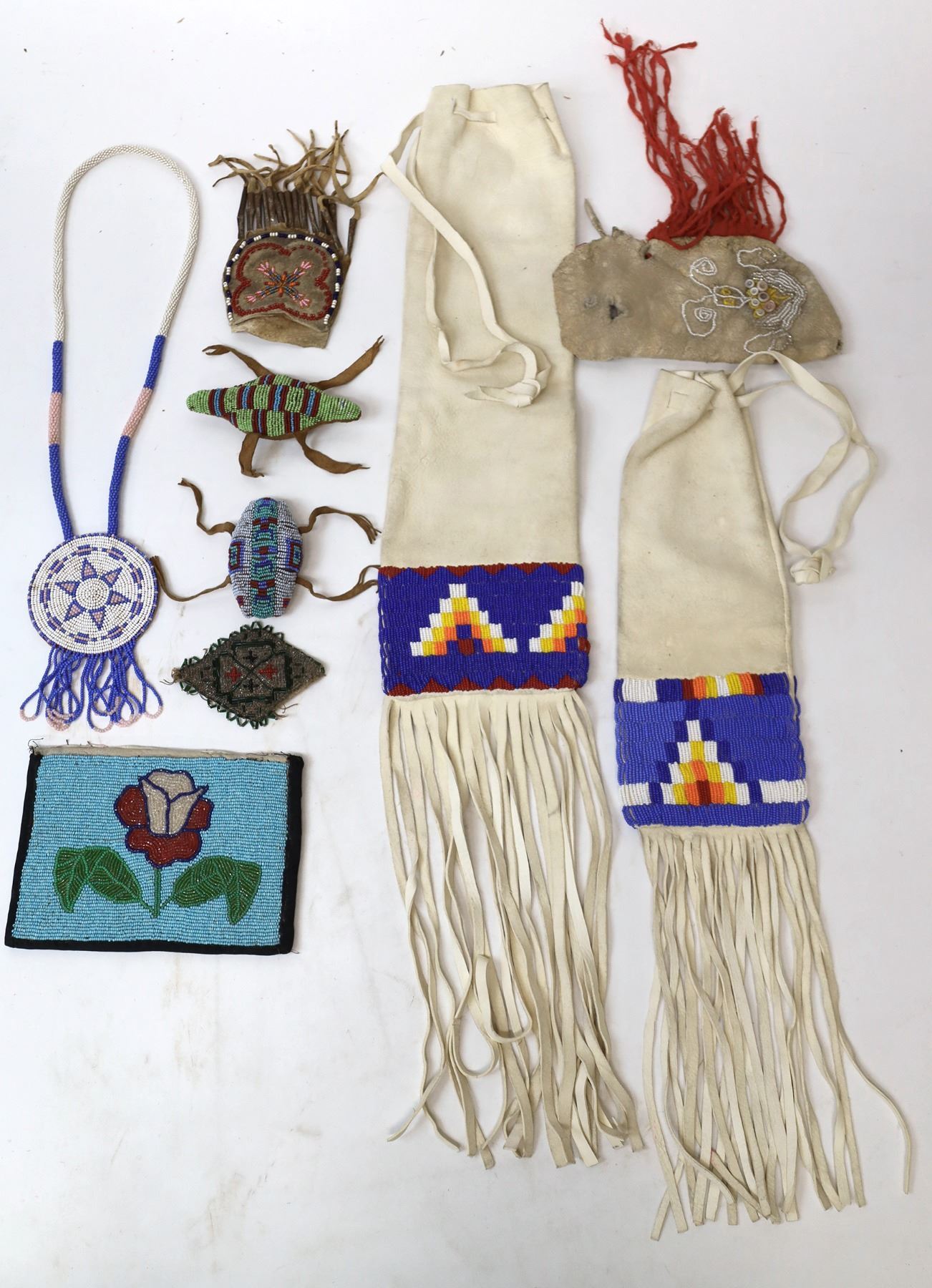 Group of various items: 1) Two Plains handmade beaded pipe bags. White buckskin and blue, white , yellow, orange beading, with fringe. 2) Vintage beaded coin purse--floral design; 3) Two pouches--small buckskin, beaded and fringed 3" wide; and crazily beaded buckskin pouch with red fringe. 4) Hand beaded Pow Wow medallion necklace--blue and pink. 5) Two Plains beaded animals-- vintage beaded leather fetish--lizard amulet (green, blue, red; oval lizard or beetle (pale blue, blue, red. 5) Pair black, silver and red beaded earrings (some edge damage. Please inspect all items.