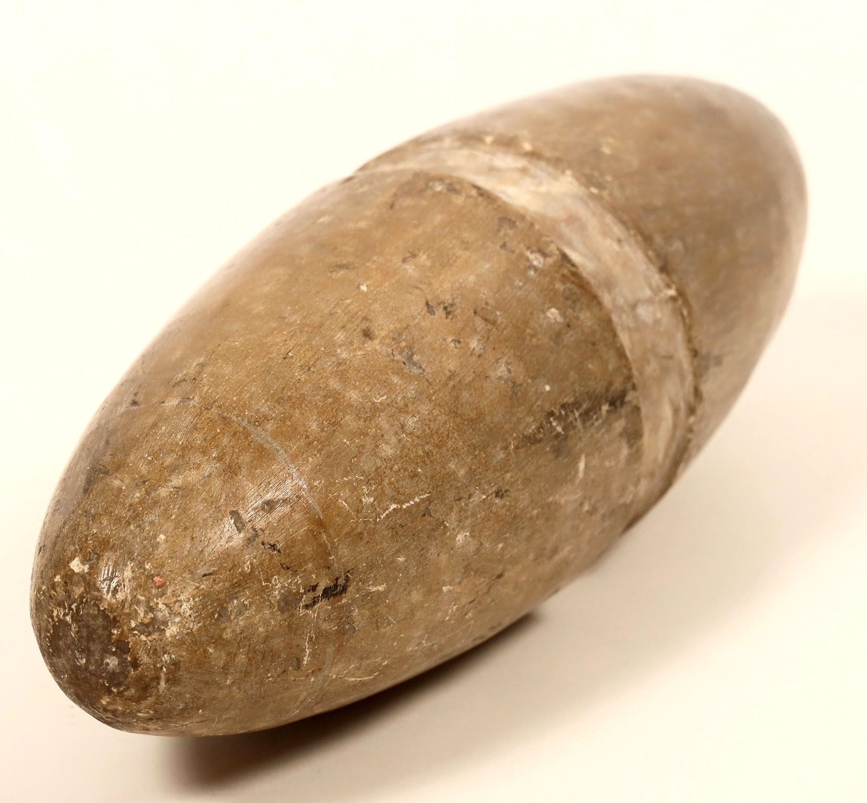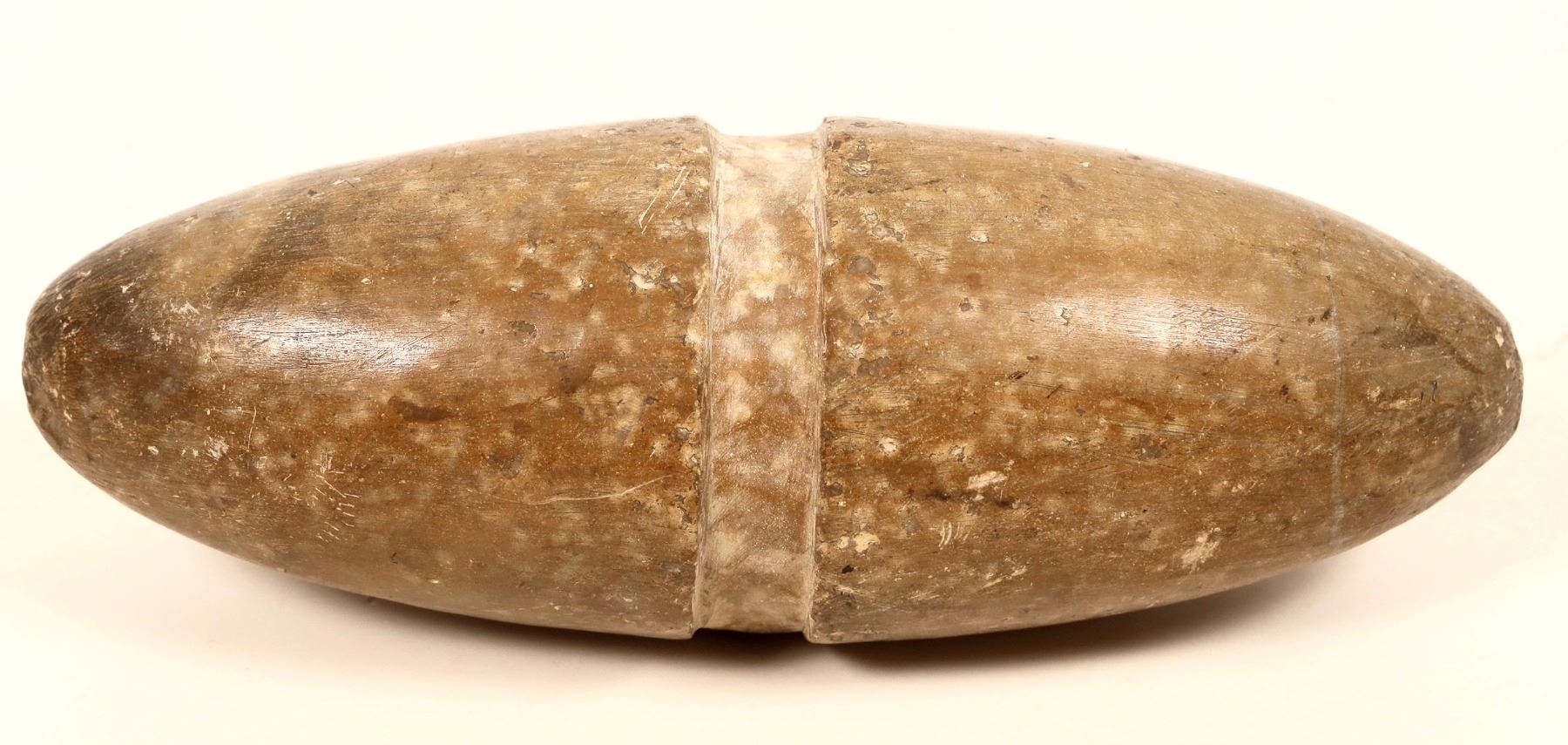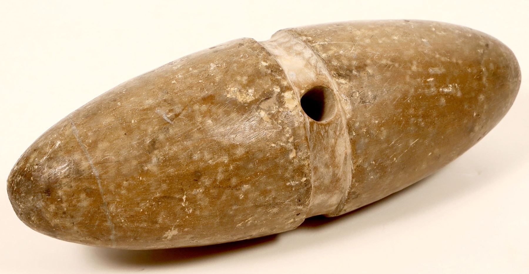Tan colored contemporary Native American stone toolhead. Center attachment channel with bored hole. 7x2.5".