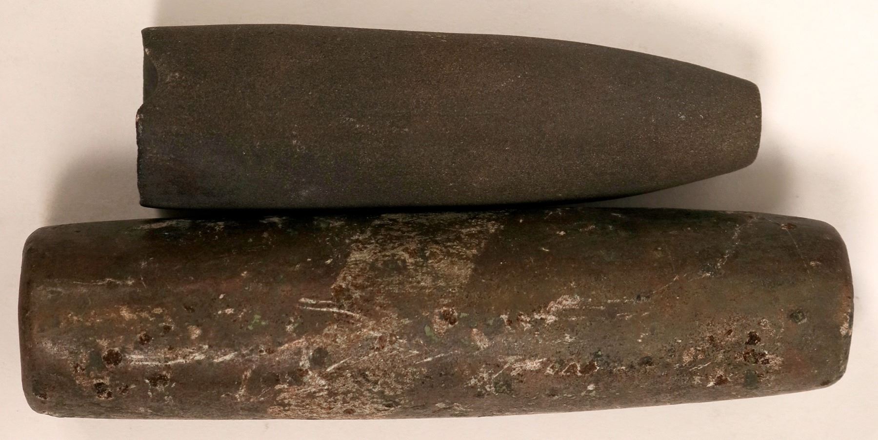 Two historic Native American tube pipes, handcrafted of stone, from the Sacramento, Calif. area. The largest is 5.25 inches long, and is straight from end to end with the same size openings on each end (about 1.25 inch diameter). The smaller is about 4 inches long and larger at one end, with one end 1.25 inch, and the other about .5 inch. There is a small chip in the larger end, but it doesn't compromise the strength, beauty, or significance of the pipe. Both are made of greenstone.