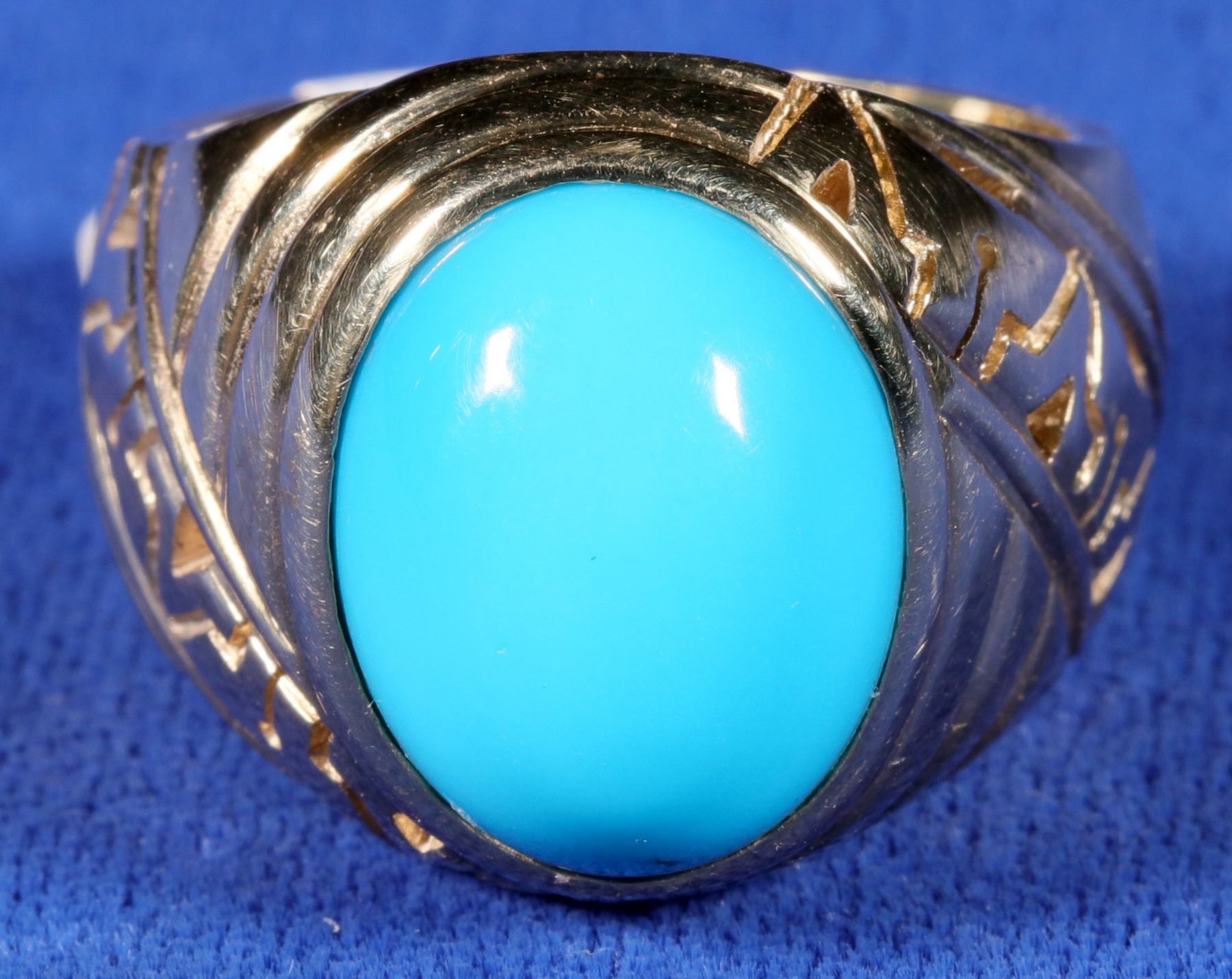 Man’s 14K gold ring, Native American etched design. 22.8g. Set with oval unblemished Bluebird turquoise stone. Excellent condition, size 11.