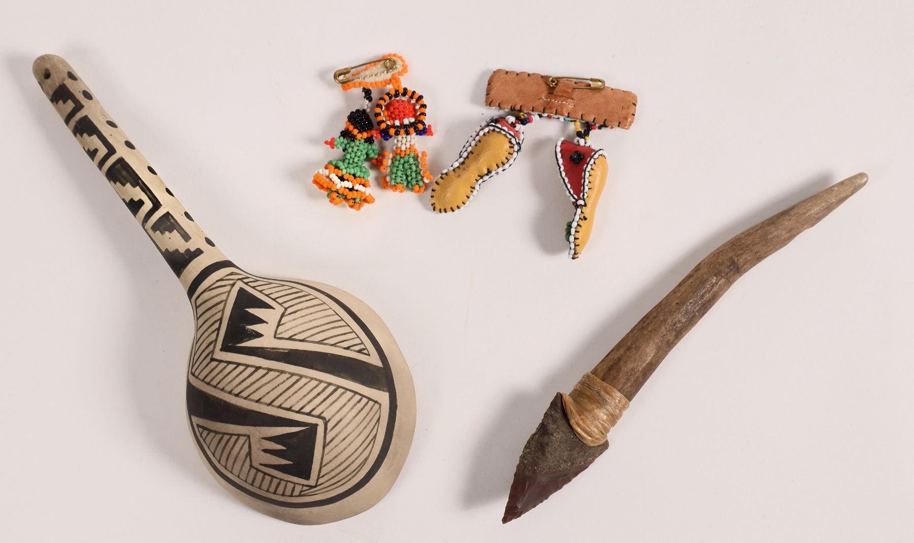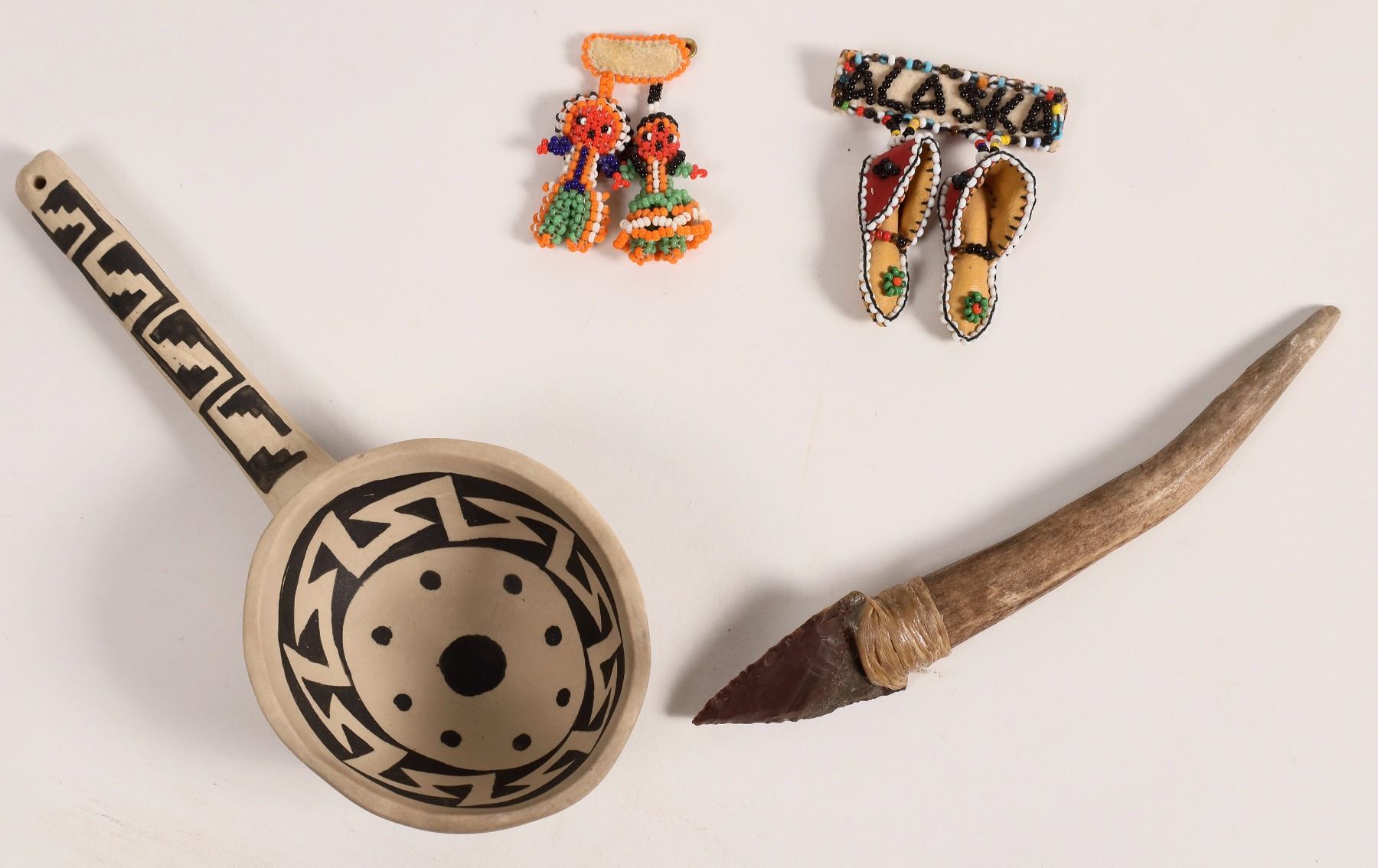 Modern Native American bone and stone blade knife 6.5x1". Modern spoon in Anastasi style signed CA, 1 3/8x7.5x3". Small Beaded Alaska pin and 2 person pin.
