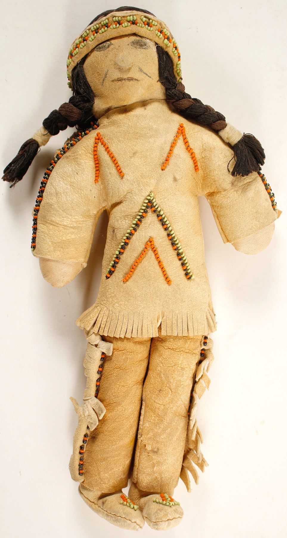 Beaded Doll, smoked buckskin male doll. approx. 12" length x 5.5 width. Beads are orange, green & black. From the Salvatore Falcone Collection.