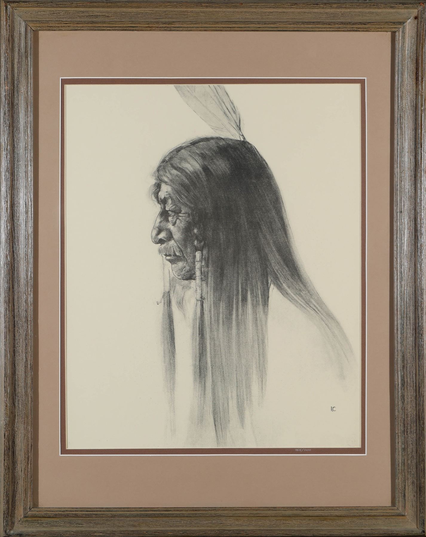 Framed Native American man charcoal by Caples. Signed RC 464/1000. 19.5x15.5", frame 29x23"
