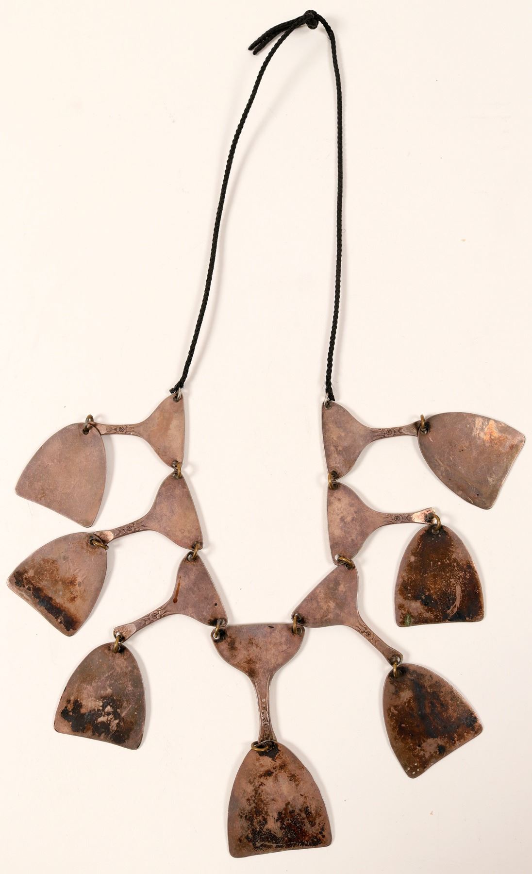 Very interesting and unusual , " Lucky 7" necklace. This item was made from silver spoons, with the Tudor Rose pattern, which can be still seen on the pieces. Perfect condition with natural patina still present. Probably made for an important person. Over $80.00, in just the silver alone!! Buy this piece, and you may get lucky too. !! Very nice and well balanced.( RH).