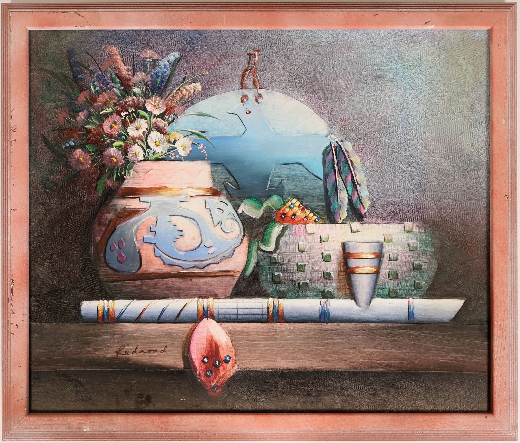 Redmond, Native American Pot Still Life, 20 x 24", signed lower left. We found numerous paintings by redmond but were unable to find a story of the person. The other piece is 24 x 30" by Glen Dodge. This is also a Native American Pot Still Life. We were unable to find info on Dodge either. Both paintings are stunning.