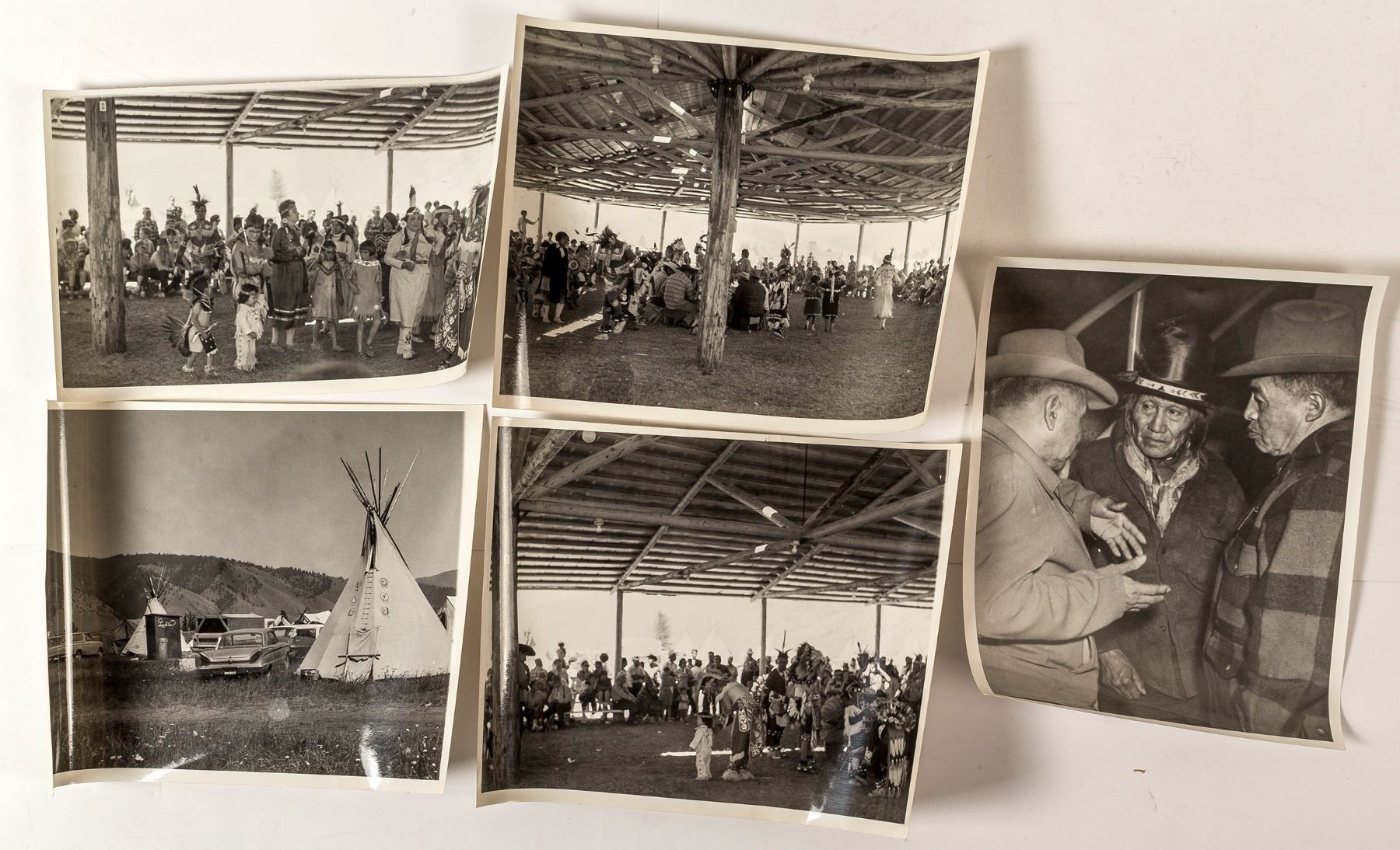 c. 1950's 8" x 10" black and white photos depicting several tepees in a camping area (this photo has some light water spots), 3 photos of Native Americans in ceremonial dress. 3 Native American men conversing and a 6.5" x 10" photo of Native Americans in ceremonial dress. Photos were taken by Montana author and photographer Donald E. Miller.