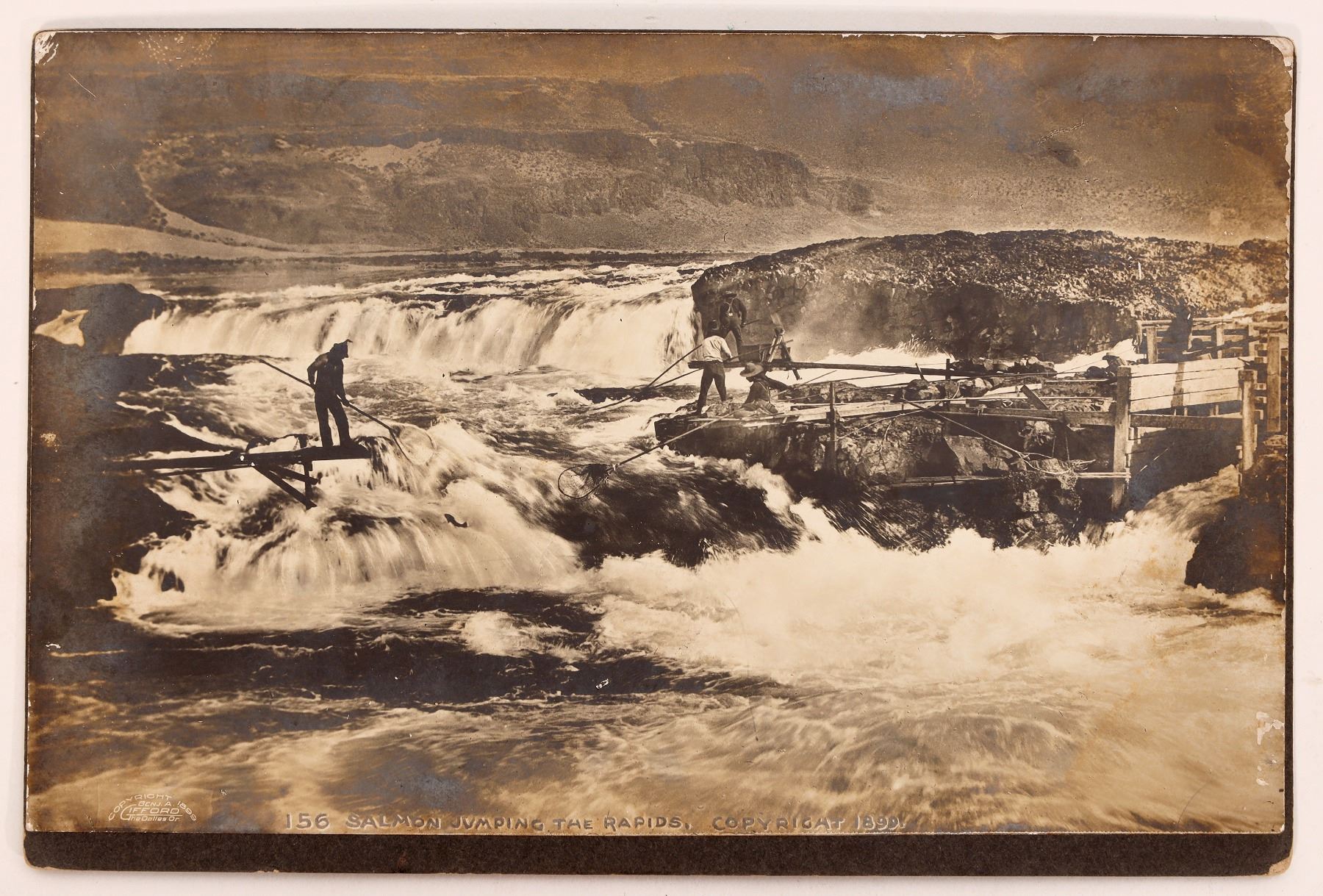 1899 photo, Salmon jumping in the rapids, by Benj. A Gifford, The Dalles, OR. Native Americans fishing on river edge platforms. Appears to be Columbia River. 5x8". Some light edge degradation. Please inspect.