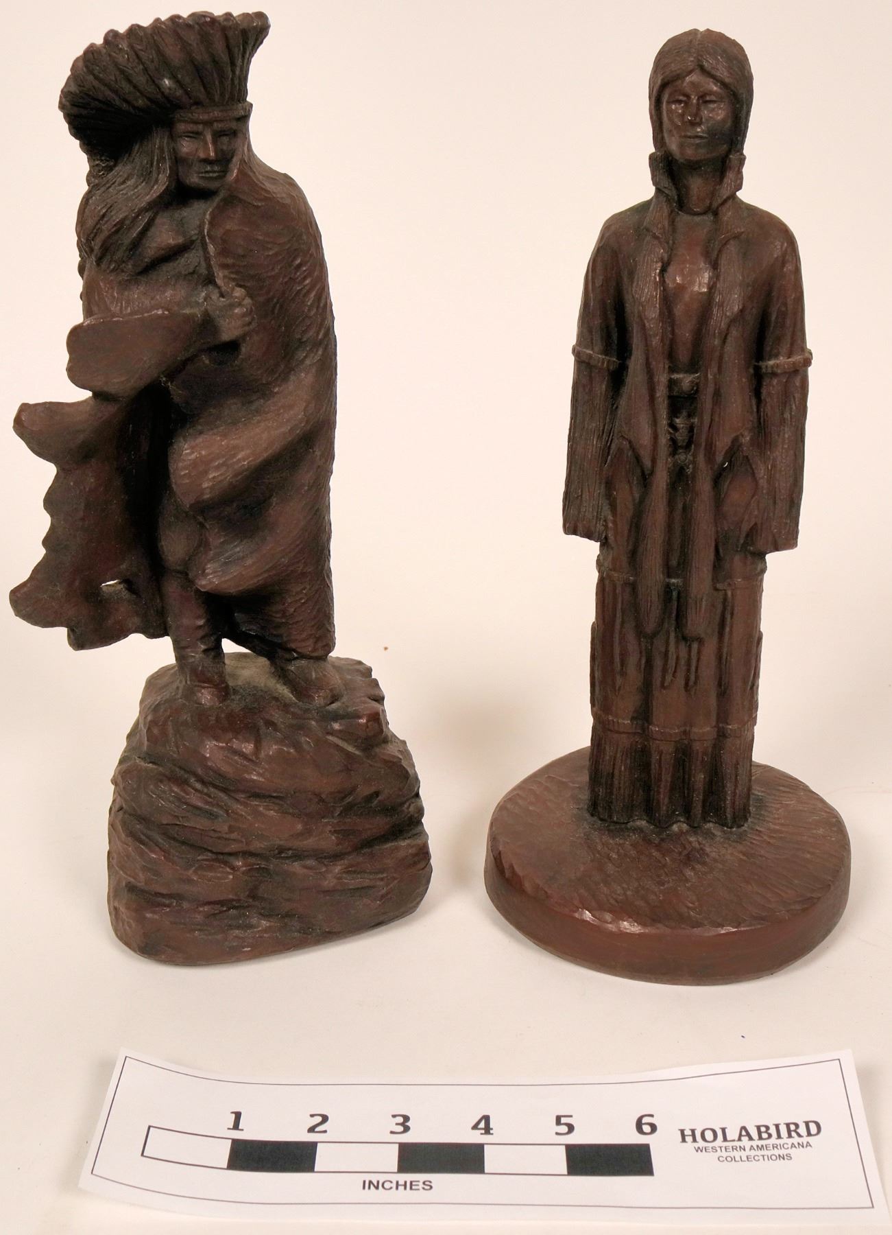 Two sculptures of Native Americans--one woman and one man. They are both signed by Largo (Cord Largo, son of J. Largo. Both approx. 12" high. Not bronze, but a resin material, brown color.