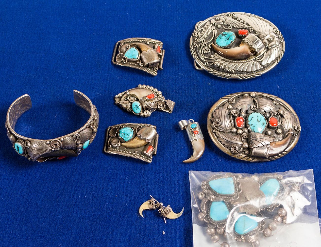 Seven pieces Native American silver turquoise jewelry. Some with bear claws or faux claws. Buckles, brooch, broken necklace, wristband, two pieces of a watch band. Please inspect. Some pieces signed. This is a bit of a jeweler's lot. there are two beautiful belt buckles: one sterling, unsigned, but slightly broken claw, the other is not silver. The wrist band is a beauty, with slightly loose claw. The 2 watch bank pieces are beauties. Nice group. Date: Location: HWAC# 58250