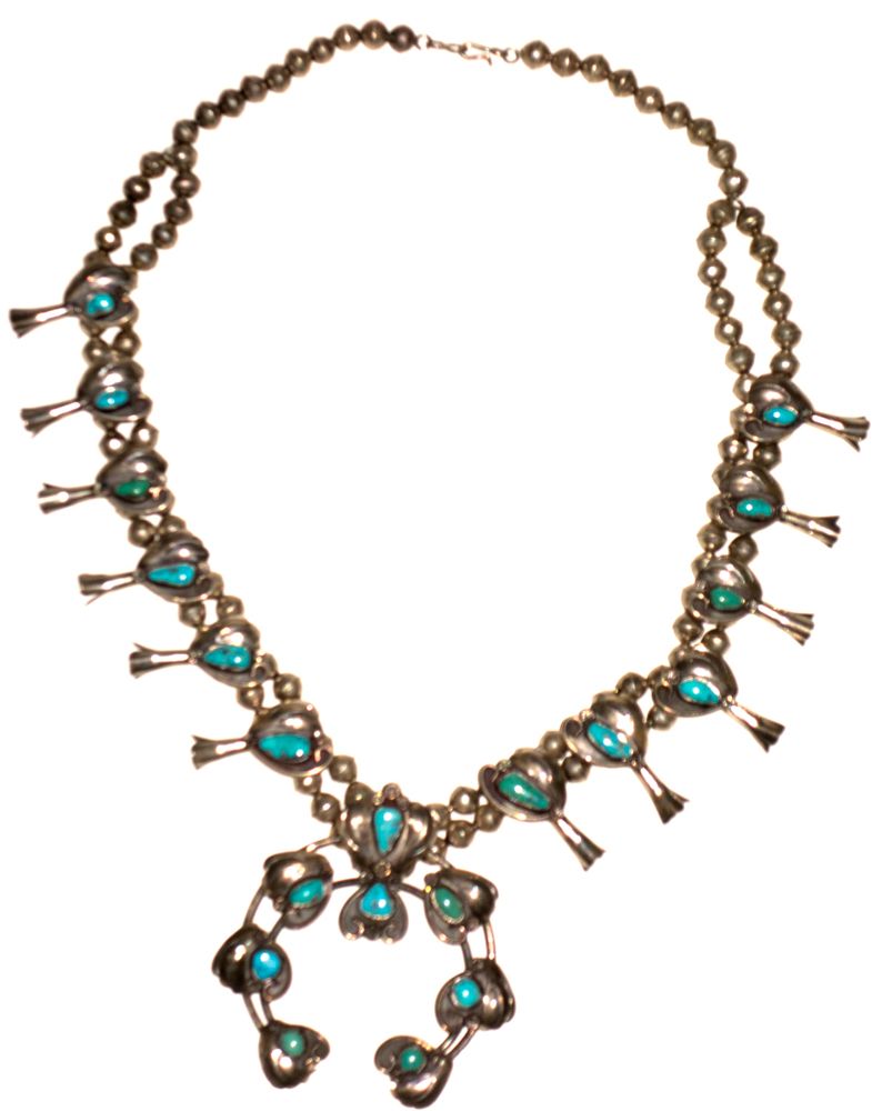 Beautiful silver & turquoise piece, with flower decorative trumpets. Great workmanship, measures about 15" top to botttom. Unique central shape. Excellent condition.