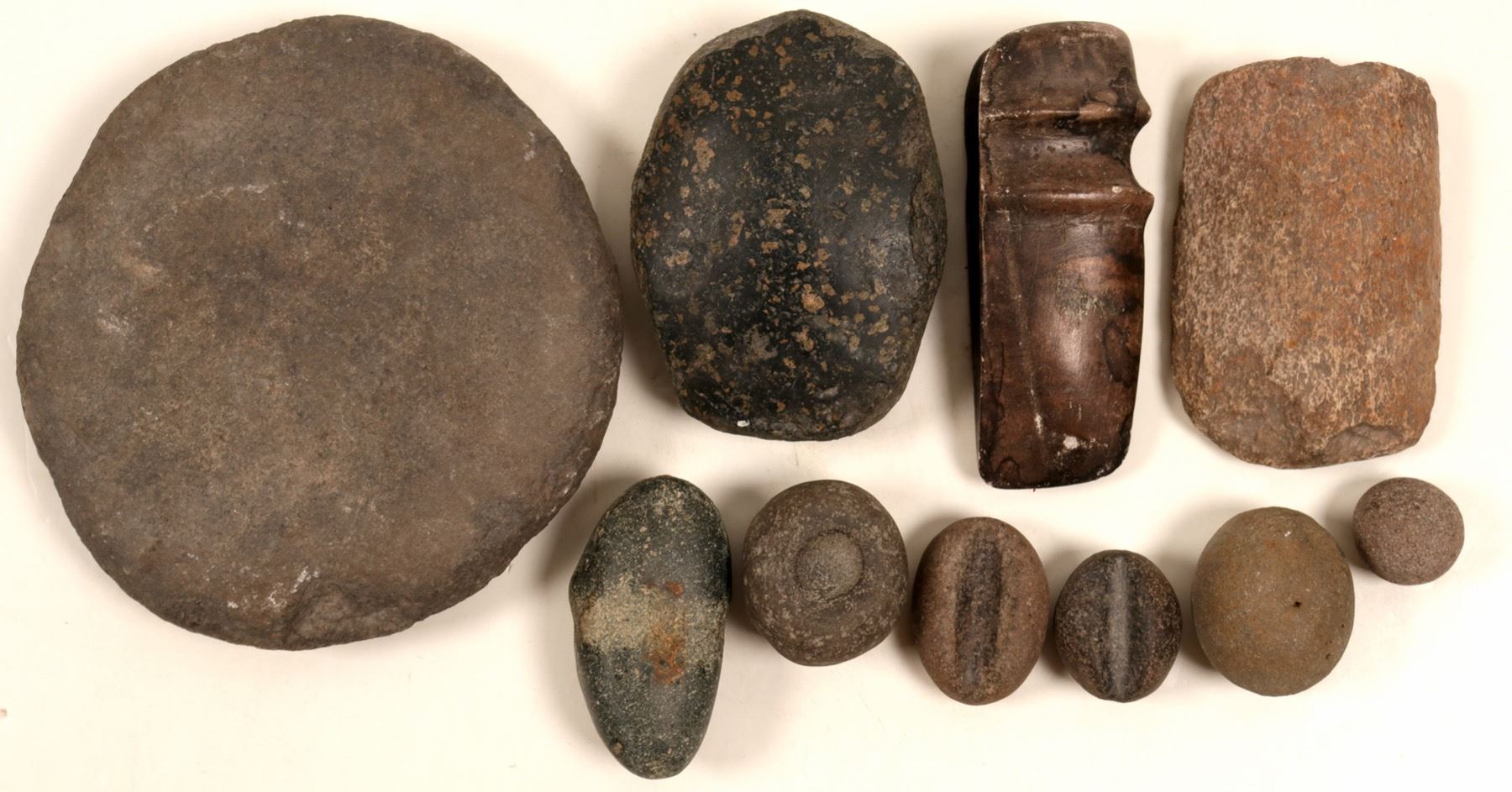 10 Native American stone tool artifacts with a nice tool head. Size range 1.25-6.5" disc