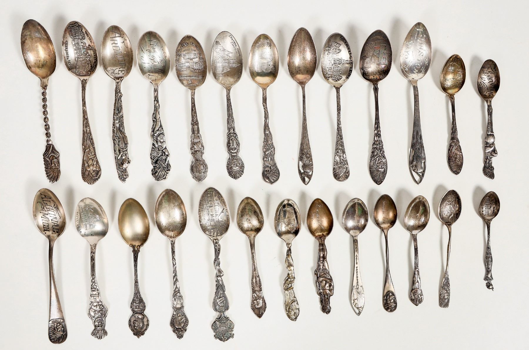 Lot of 26. Die struck Indian themed sterling silver spoons. Various sizes. with no duplicates. Sixteen are standard teaspoons., 9 are engraved, 4 have die struck bowls, 10 a small spoons. Two of the listed are nudes.