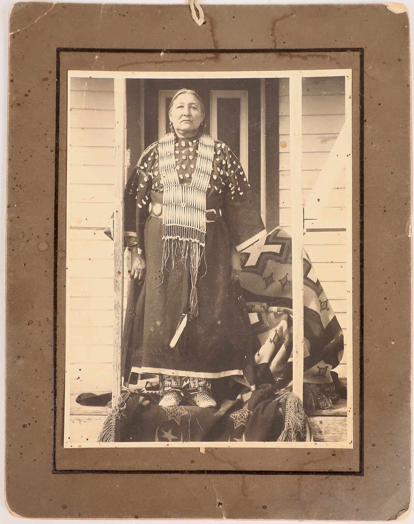 6.25x4.75" photo of a Native American lady adorned with bones and shells. 2 blankets visible.