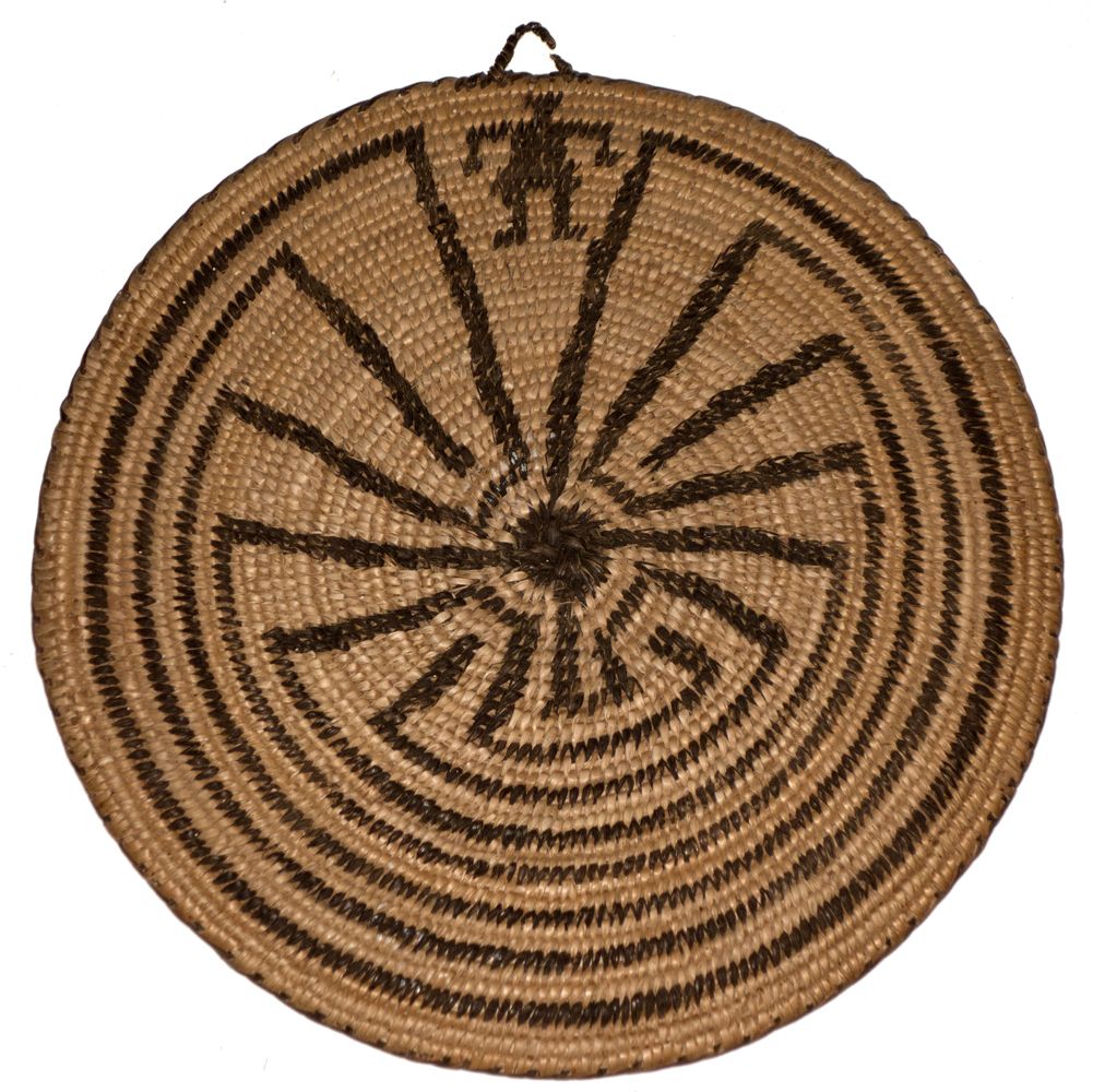 Small round tray, with geometric "Apaci Tracks" design. Measures almost 10" in dia. Sharp coloring, excellent condition.