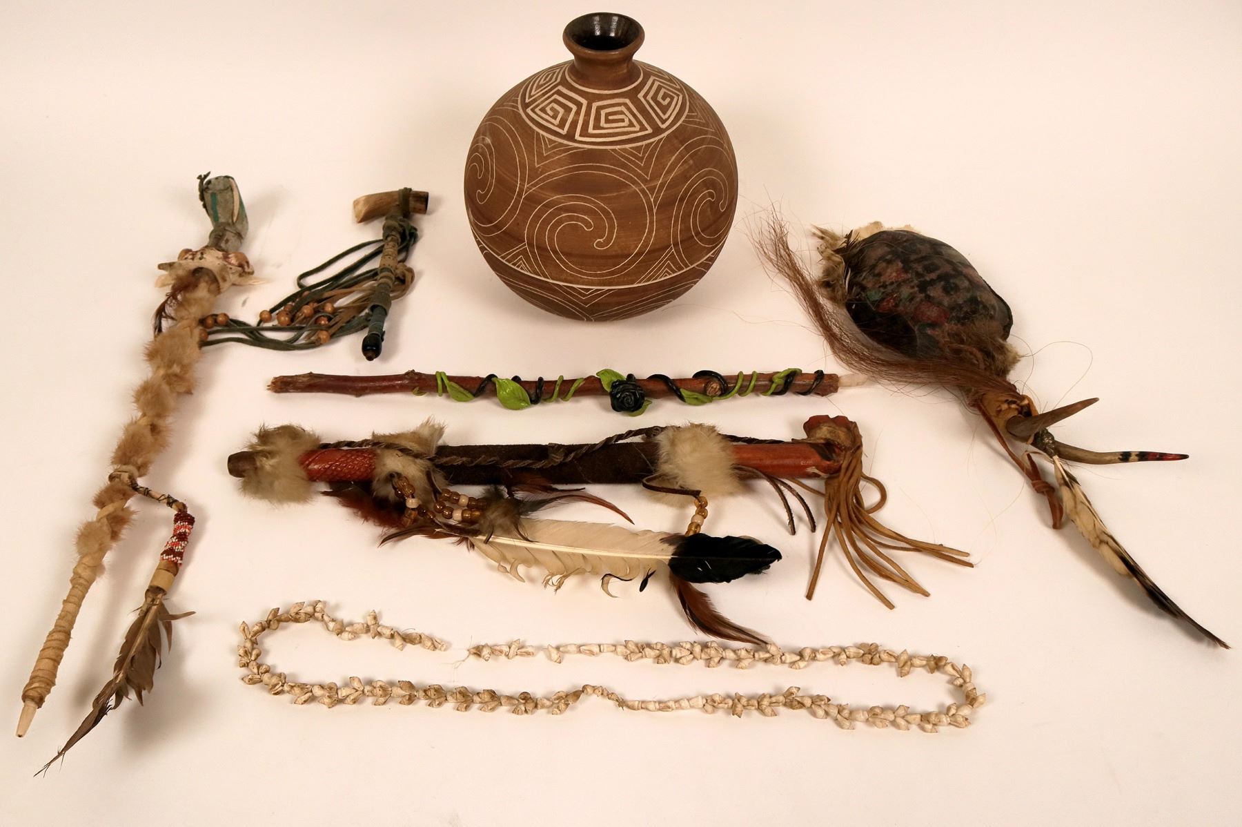 This is a collection of 20th C. native American pipes, shell necklace, and 8 in. diameter water jug, and animal cape.