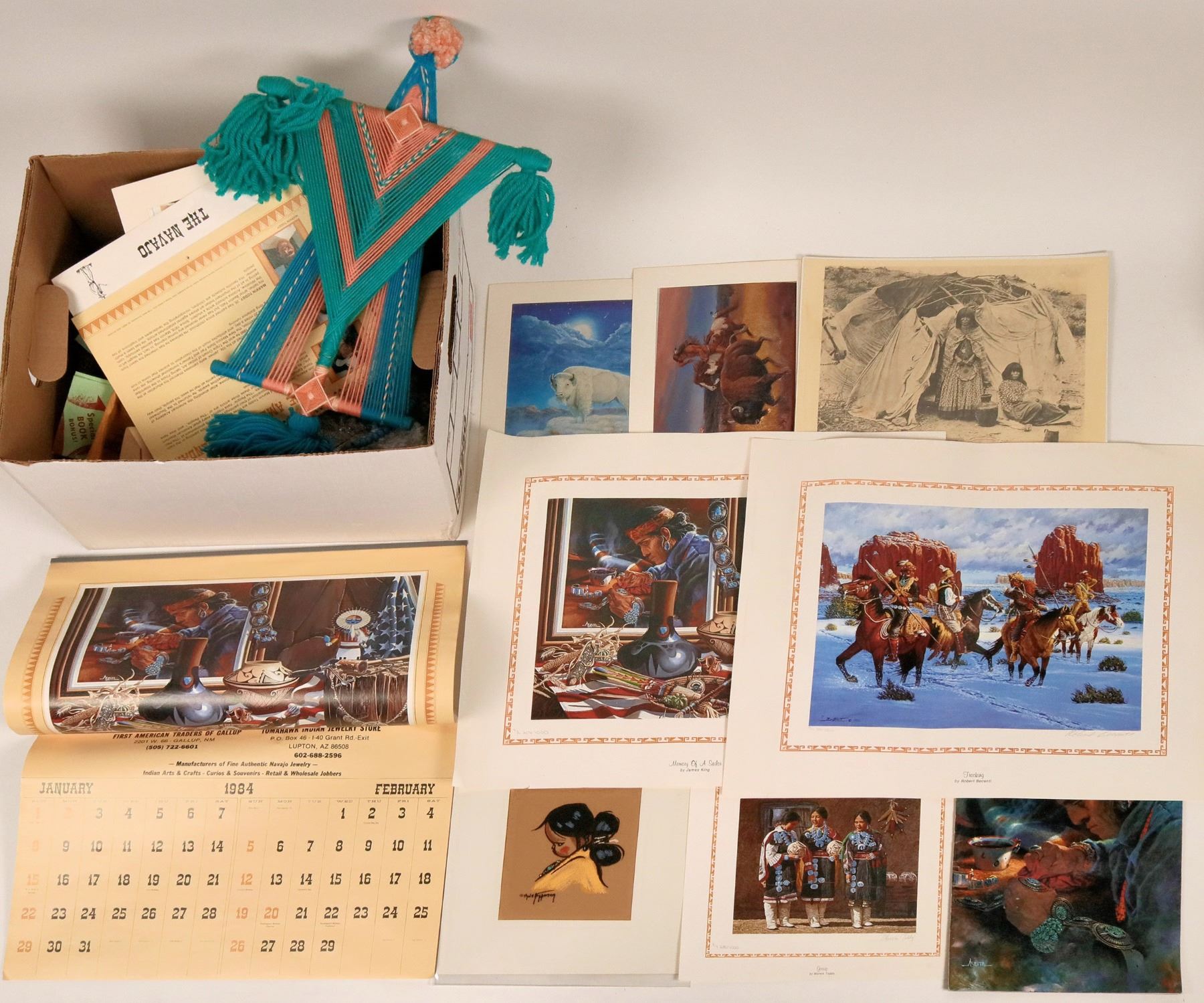 Includes necklaces, artisan pieces, pinon incense, prints, a wide variety.