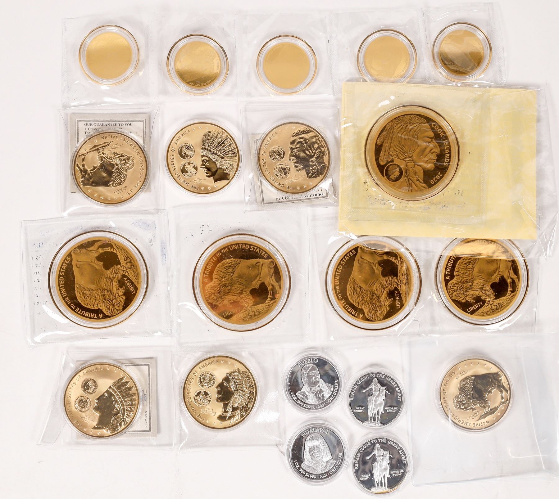 Lot of 20 coin replicas with Native American themes. National Collectors Mint Buffalos (10); American Mint: Native American U.S. Coins (6): copper layered in gold, 50 mm. American Mint: Native American Journey (2): 40 mm, copper silver-plated. Mesa Grande Sovereign Nation one ounce silver rounds (2) each one ounce .999 silver.