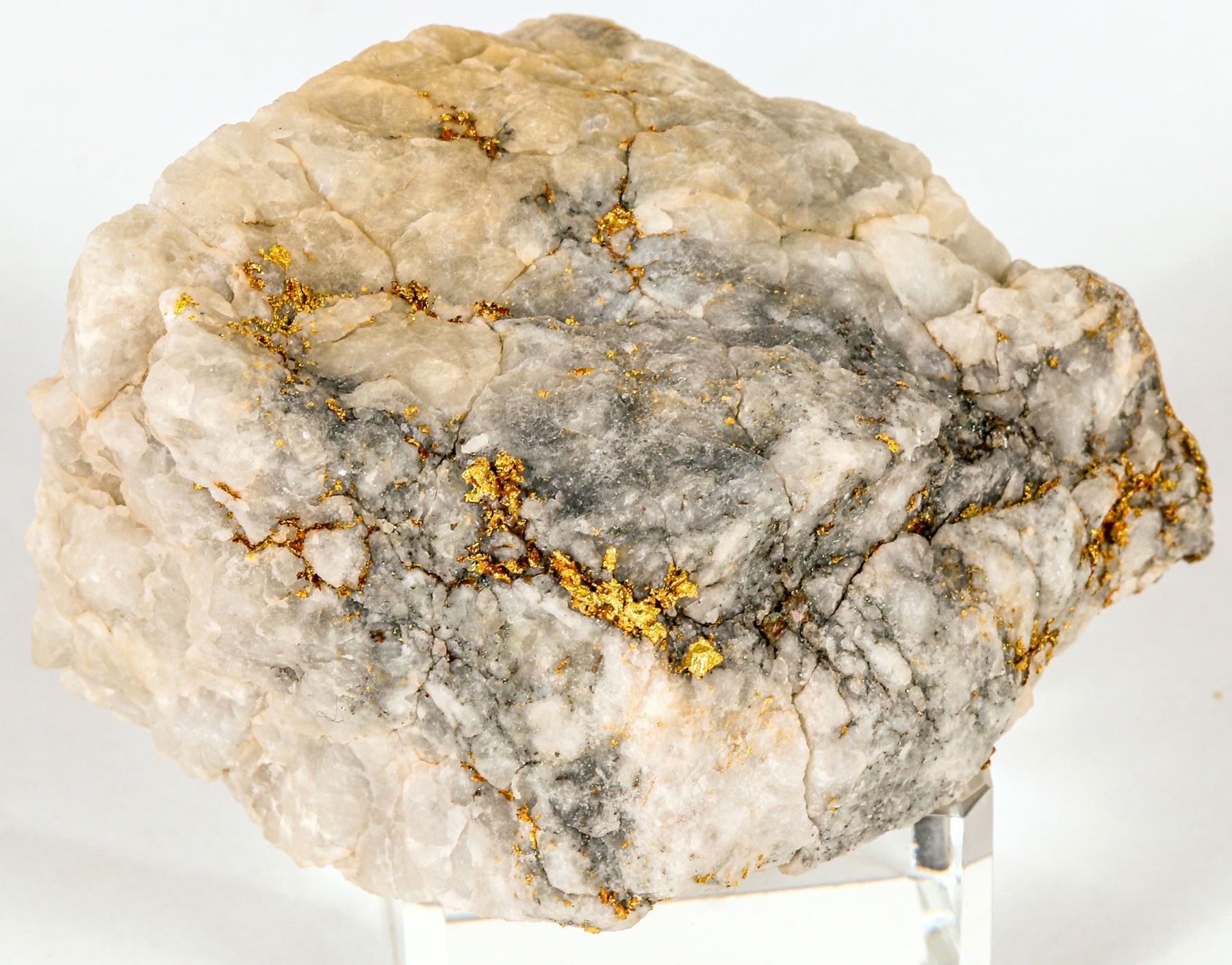 Timmins, Ontario is Canada's richest gold region. Most of the major production took place after 1900. The city of Timmins was founded in 1911. The gold of these Timmins specimens is all native wire and crystalline gold in quartz. Each specimen has a calculated gold content from specific gravity measurements. This piece is 169.9 grams gross weight; 17.7 grams gold contained by specific gravity; 57 mm x 35 mm x 52 mm.