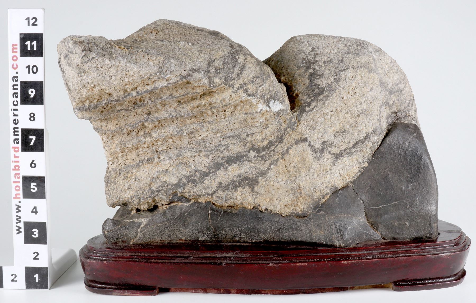 Chinese Viewing Stone. Blk-Wht-Gray. Appears twisted. Custom wood stand. 18x7x12" China Billions of years ago Chunlin Zhu Collection