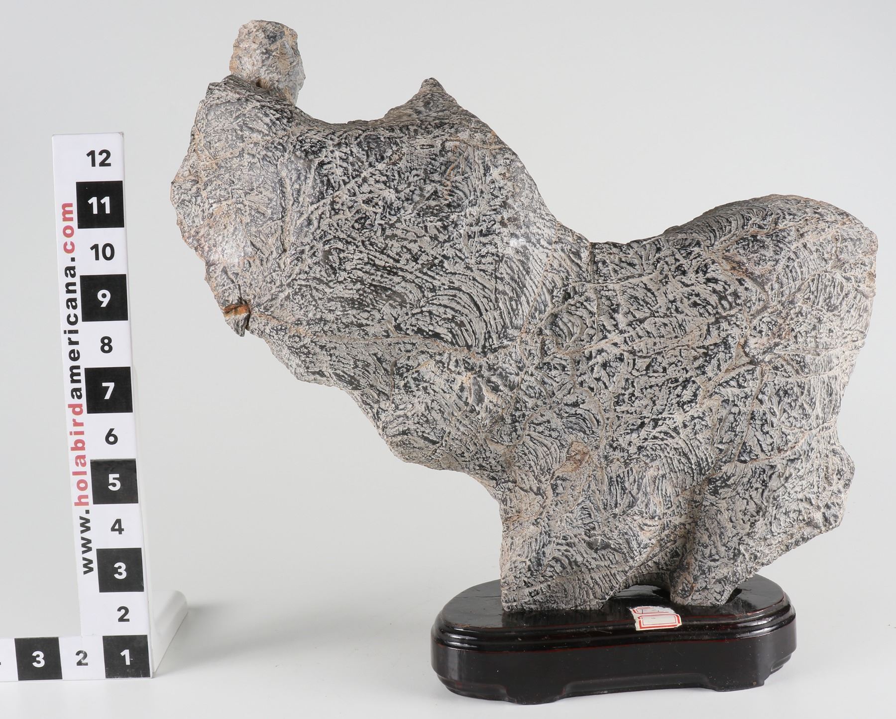 Chinese Viewing Stone, black/gray/orange erosion on a custom wood base. approx.17x17x7" China Chunlin Zhu Collection