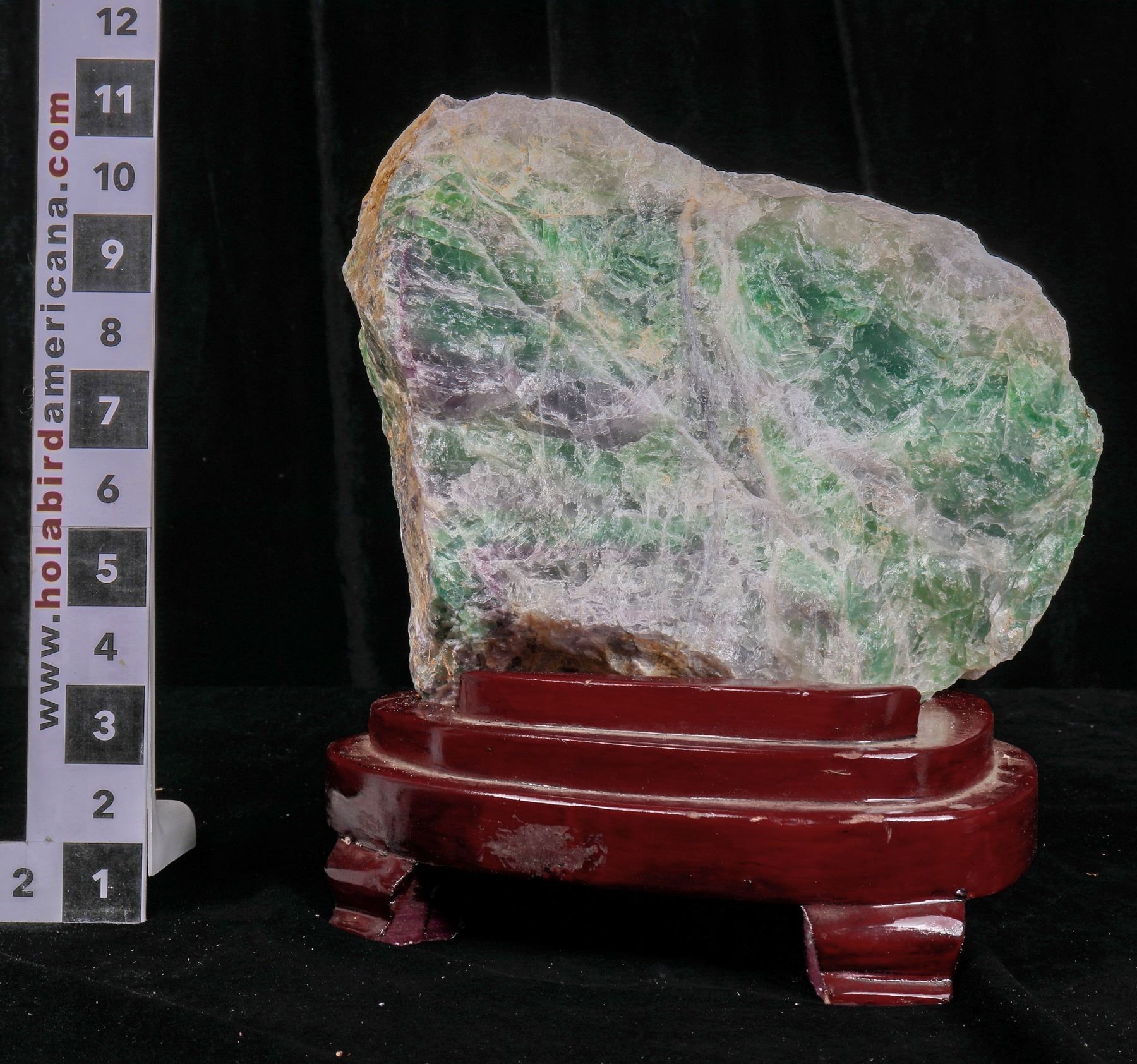 comes on a wood base. Massive white green and purple fluorite. 10 x 7 x 5 China Chunlin Zhu Collection