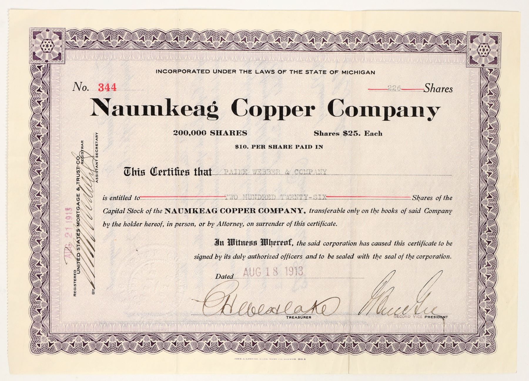 Inc. in Michigan. No. 344, issued for 226 shares to Paine Webber & Company in 1913. Signed by the second vice president and treasurer. Not cancelled. Black print on purple background. 7.5 x 11" DeGood pg. 251, R-6. Owned 1200 acres just west of Houghton.