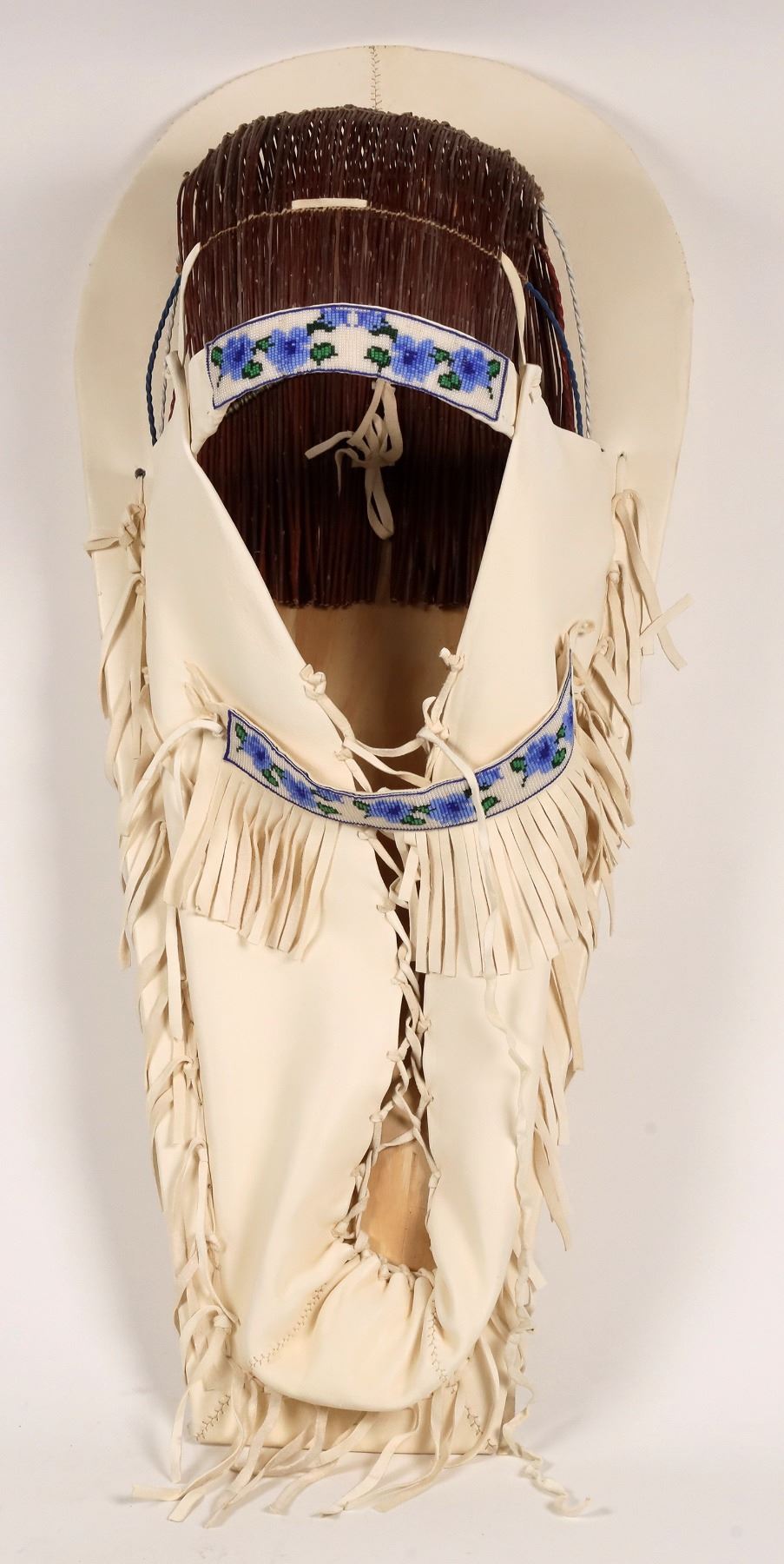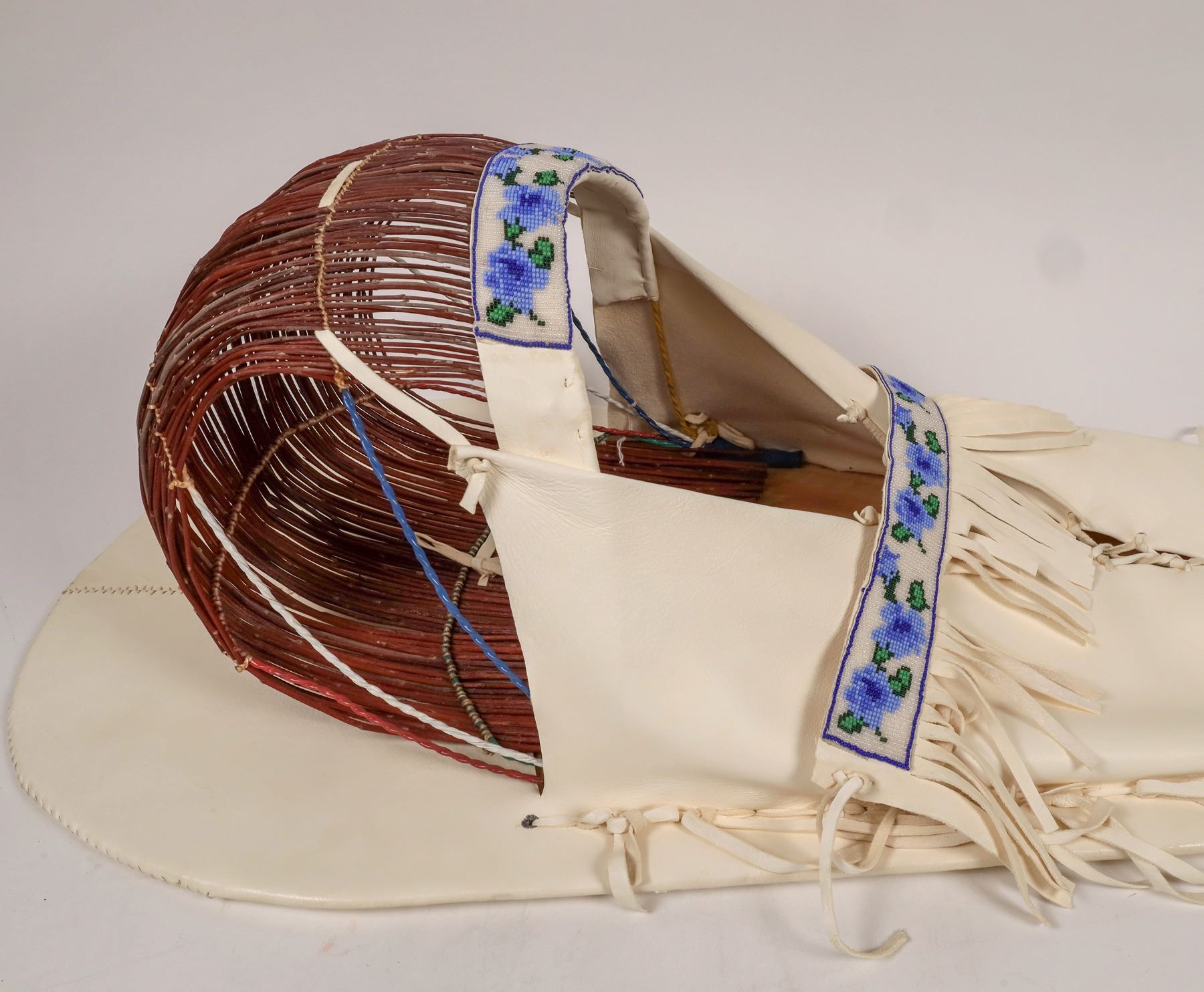 Nice Navajo baby board with white buckskin, wire, willow and beaded brow and belt. Unused condition. 10.5x36x16".